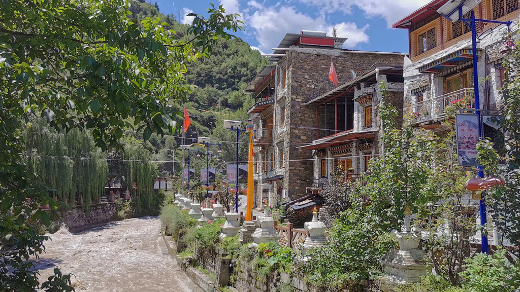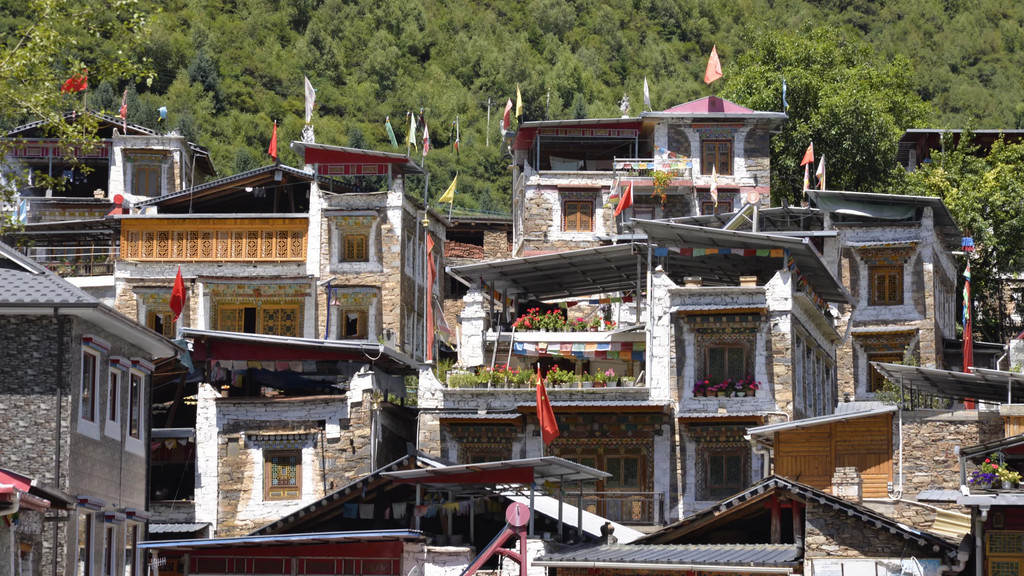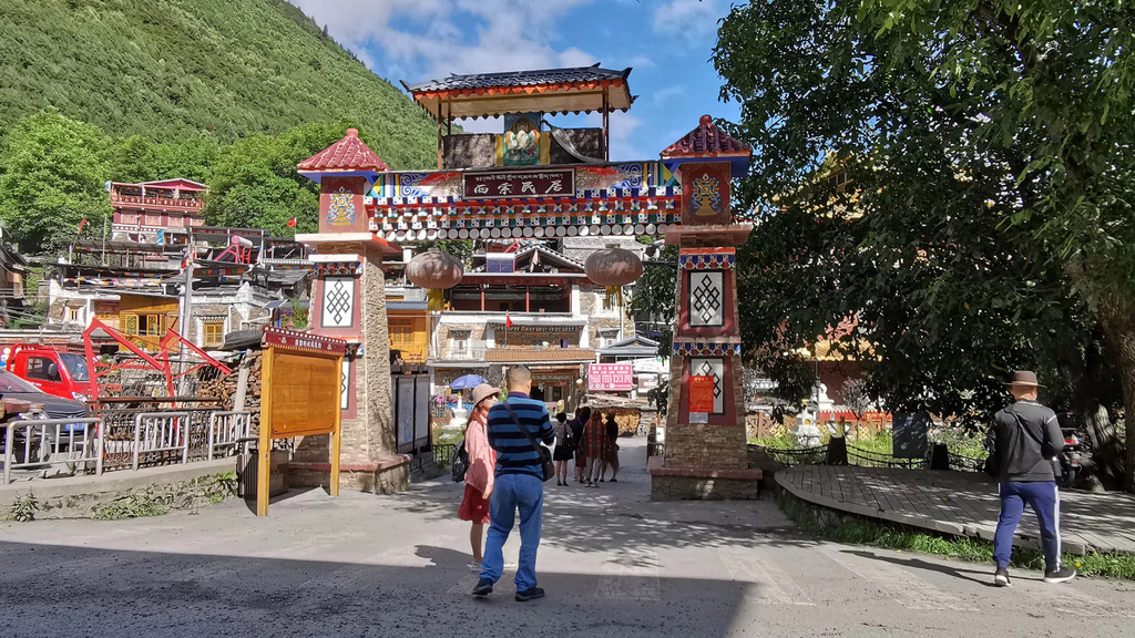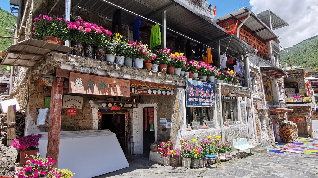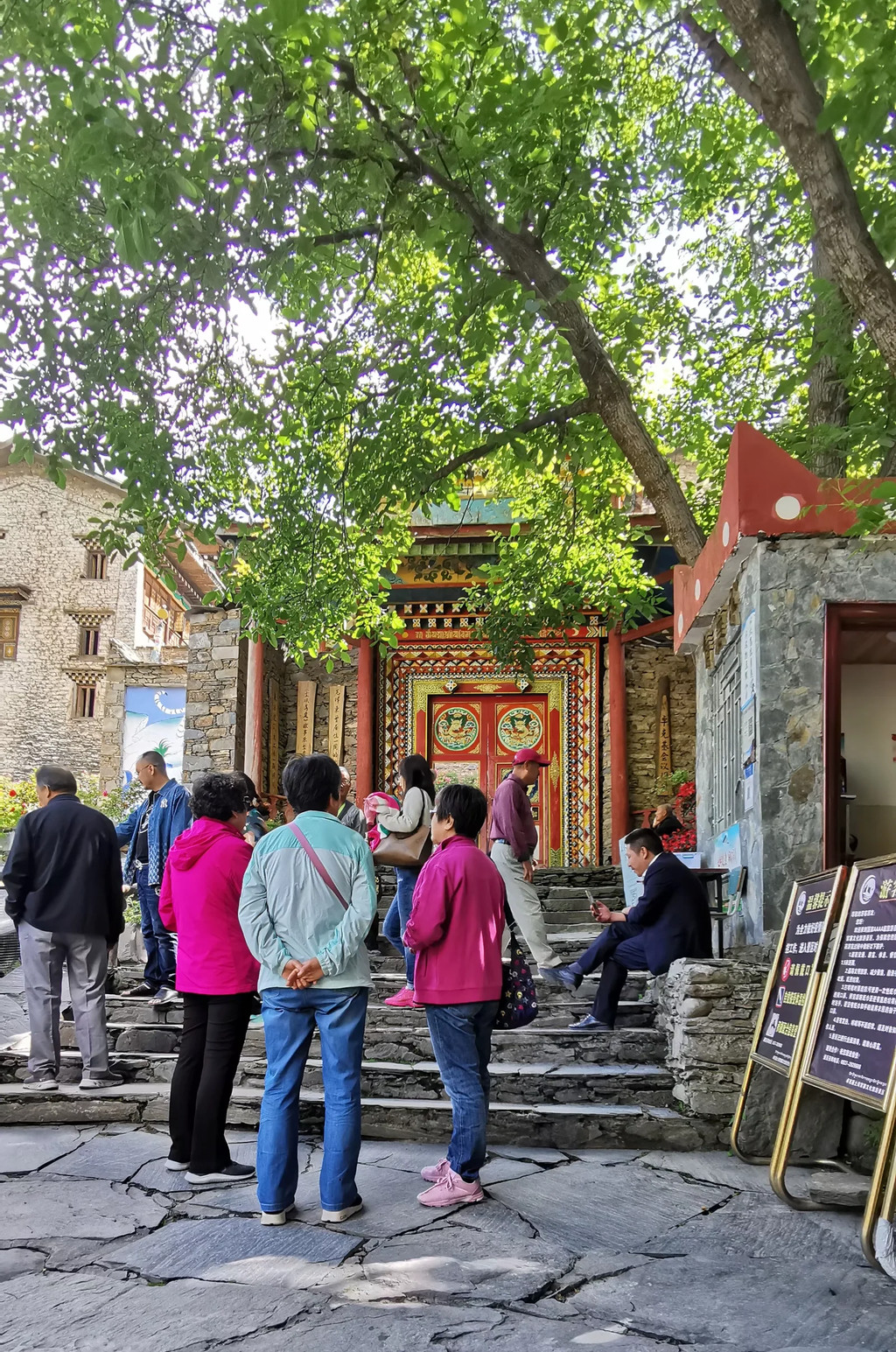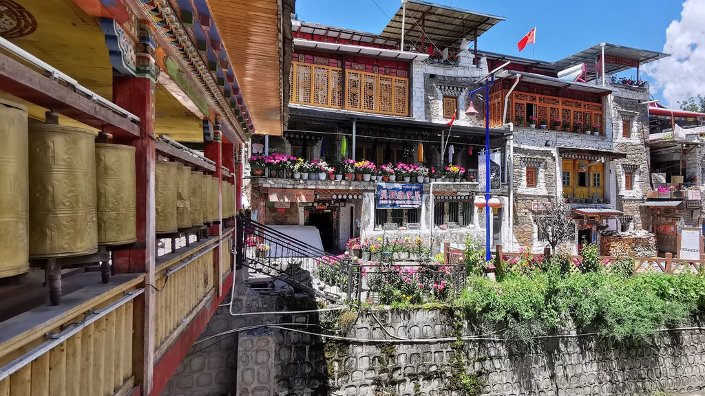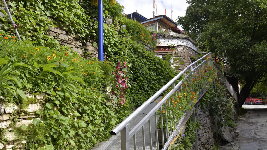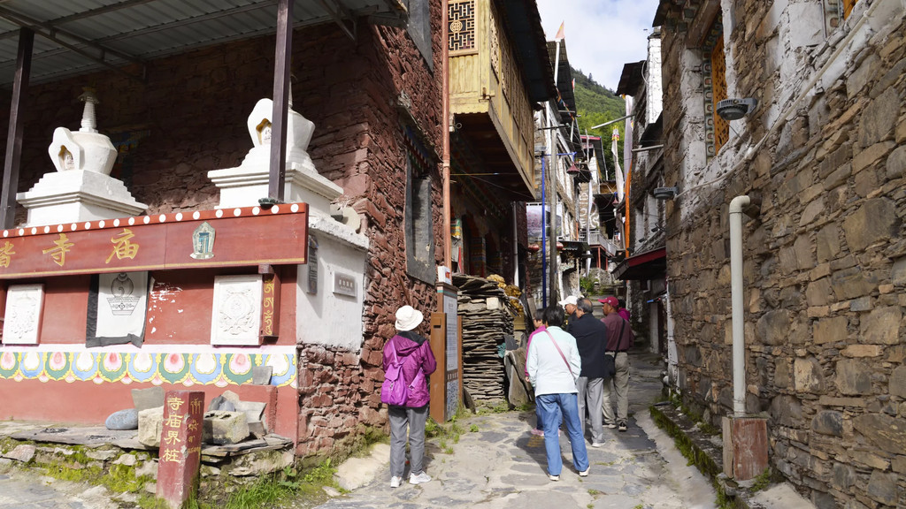 走近寨内,高耸的石壁间,细长的青石板小路蜿蜒联络起座座院落,院内及房前屋后花草繁茂,浓郁的田园特色,通幽的曲径,鲜艳的图腾房,红色的瓦片,飘动的经幡,给寨子增添了几分神秘色彩。