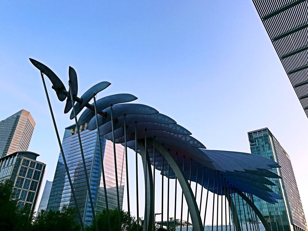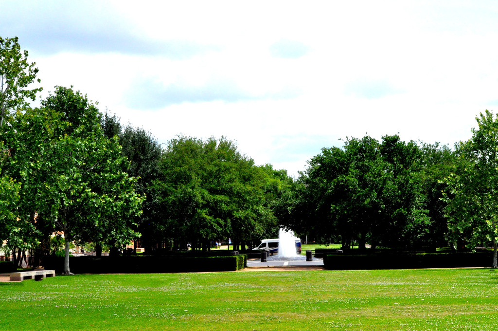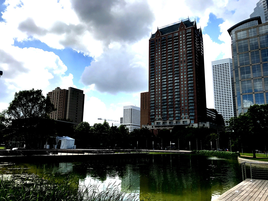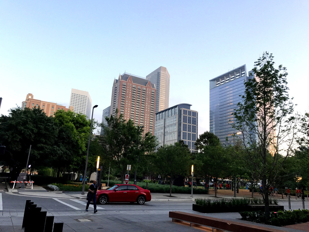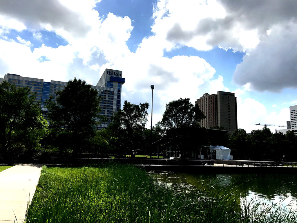 休斯顿市中心真的很小,小到没有福田中心区大。乔治布朗会议中心应该就是休斯顿的中心地带,丰田中心、希尔顿酒店等都在临近。乔治布朗会议中心前面是一个发现绿色公园,公园很袖珍,袖珍到只有一小块湿地、一块不大的草坪。我想这或许是因为美国地广人稀,几乎家家都有自己的别墅,有自己私家花园、私家泳池,所以也就不需要太大、太多的公共活动空间了。