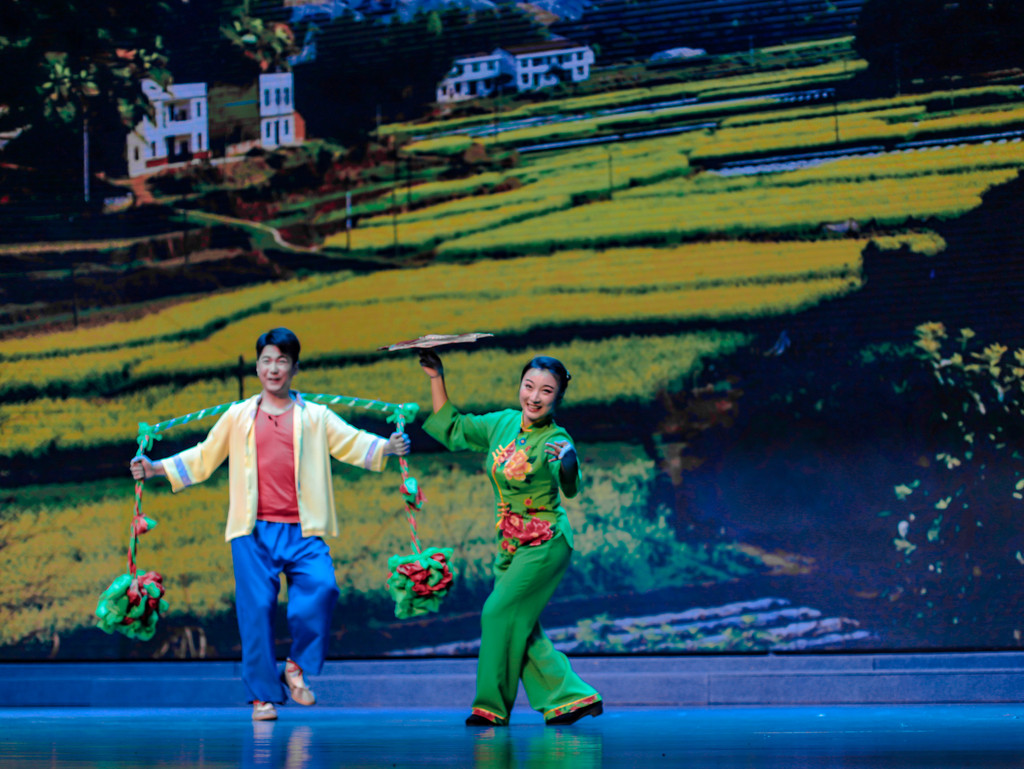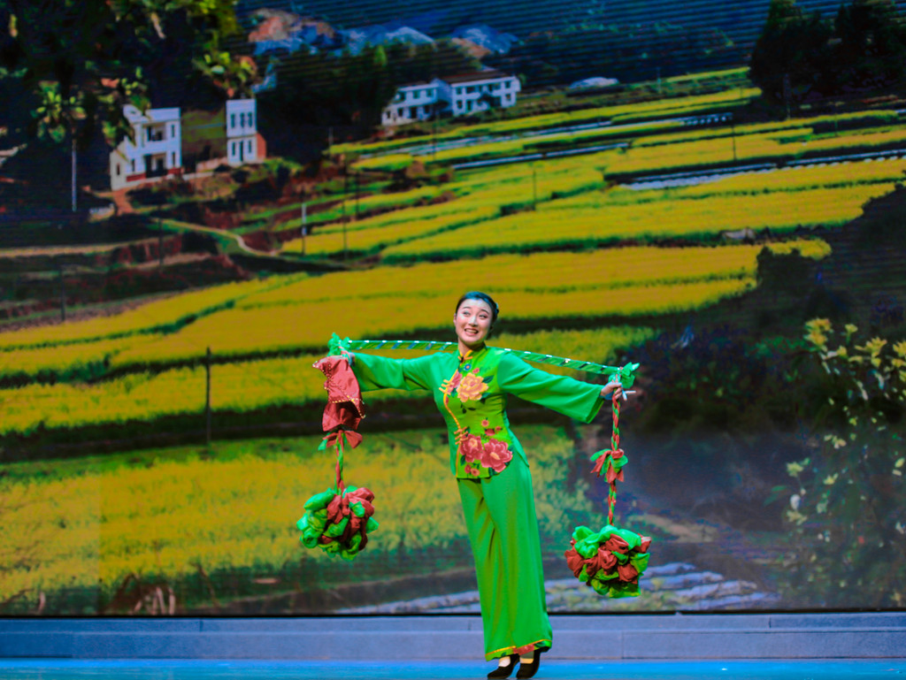 最后演出的就是淮海戏了,这个戏种就比较轻快活泼,淮海戏是江苏省主要的地方戏曲剧种之一,流行于连云港市、淮安市、宿迁市及徐州市、盐城市部分县区,至2019年已有两百多年的历史,而沭阳是淮海戏的发源地。淮海戏唱腔音乐丰富多彩,有男腔和女腔的区别,舞台上的一男一女,通过说、唱、演的形式,为我们带来了一段风趣幽默的相亲故事。这也正是应了淮海戏的特点,就是脱胎于苏北农村生活,带有浓郁的乡土气息。