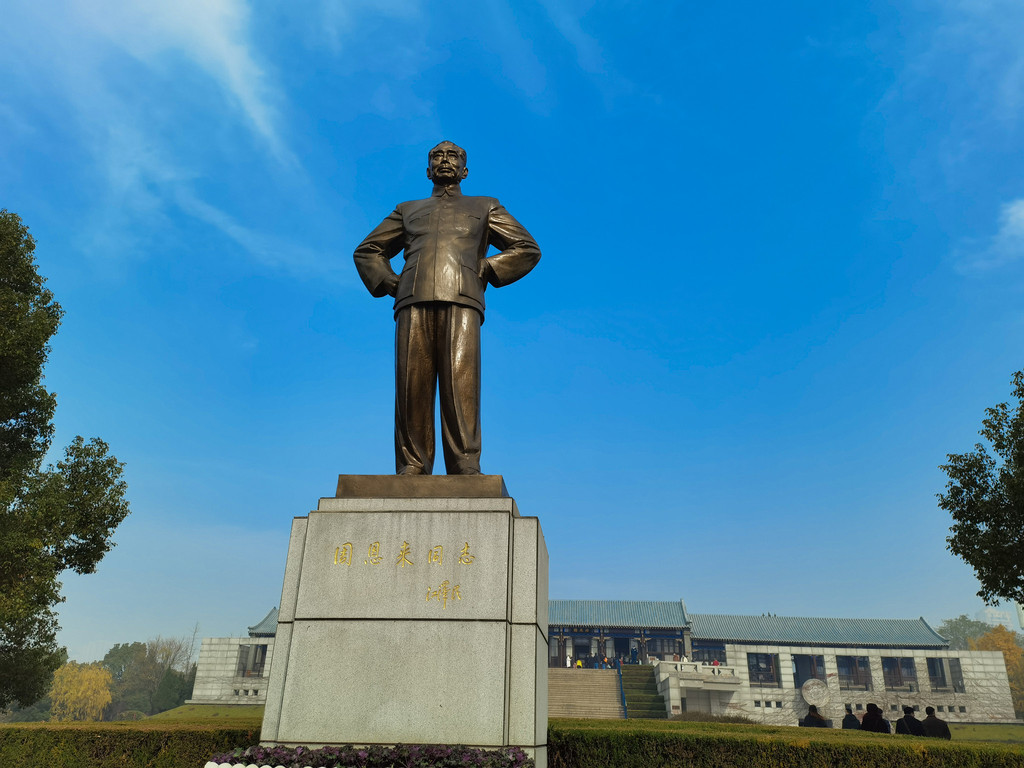 穿过副馆就来到了周总理铜像广场,这座铜像高7.8米,隐喻总理78年的伟大一生路。这座铜像的还原度极高,总理右手叉腰,面带微笑,导游介绍说,因为总理以前右手受过伤,所以他总是把右手叉腰,这个姿势来源于20世纪50年代末,60年代初周恩来与工人、农民亲切交谈时的习惯动作,展现了总理平易近人的风范,在蓝天之下,这座雕塑格外伟岸。我们在此停留很久,导游在这里为我们讲解了很多关于总理生前鞠躬尽瘁死而后已的事迹,人民的好总理,让我们每一个人为之感动,为之敬仰。