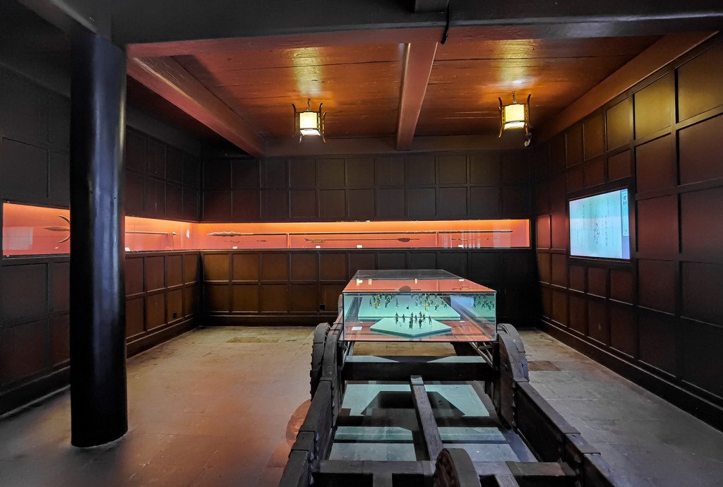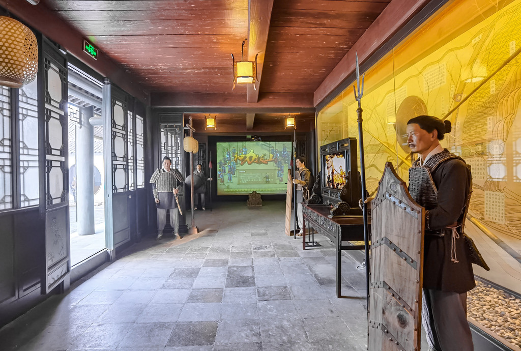 后面是习武区,习武区有冷兵器展厅、揽秀楼、演武场、瞭敌楼、关帝庙和火器展示厅组成,尤其是这揽秀楼里,分上下两层,里面不仅有展示有测试个人力量的互动节目别开生面,还有各种兵器火炮的模型,看这根长枪,就是“状元军”抗倭时用到的一种独特的兵器,有4、5米长。