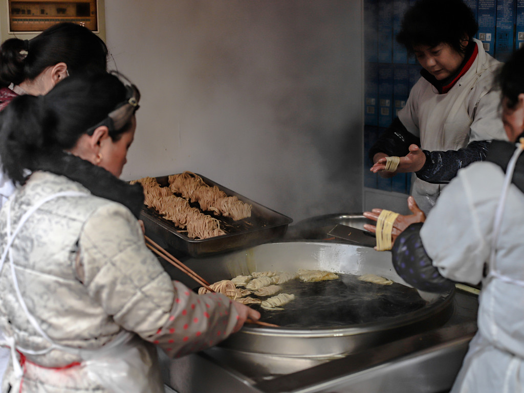 行走在狭窄的老街,青石板路两侧是古朴的居民屋,一路走来,我们看到大多数都是当地居民自己生活的模样,透着浓浓的生活气息,偶有一些营生,售卖淮安当地的特产,馓子啦、蟹黄汤包等等这些土特产。