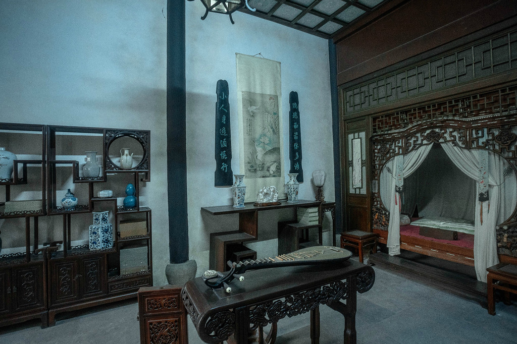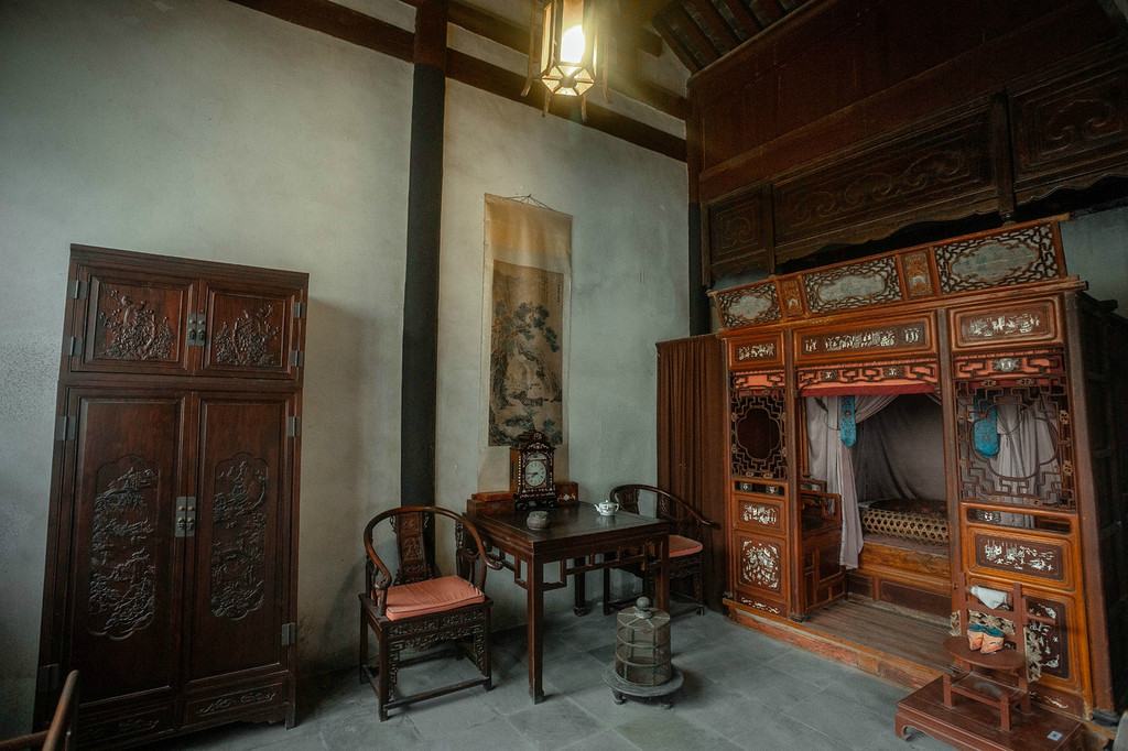 让我印象最深刻的是古宅里的起居室,在这处房间里,还吊着一个小小的摇篮,摇篮里躺着个婴儿,身上盖着红色绸缎小被,旁边还放着拨浪鼓,非常富有生活气息。