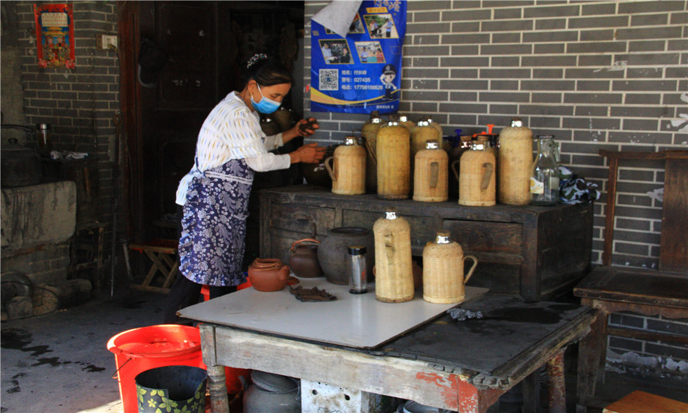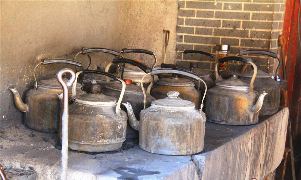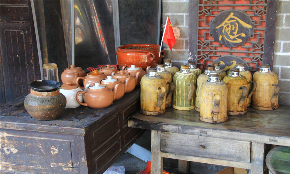 当地用的都是土瓷和粗砂的茶具,各家茶馆的茶壶式样大致相同,但颜色有别,不会搞混。