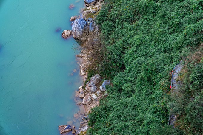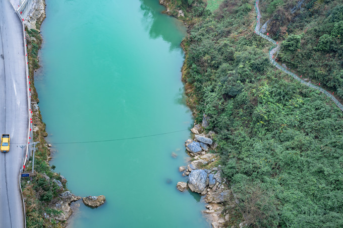 脚下是如碧的江水,沿河两岸林木茂盛,盘山公路在脚下婉转,像极了一条见首不见尾的神龙俯卧在大地上。