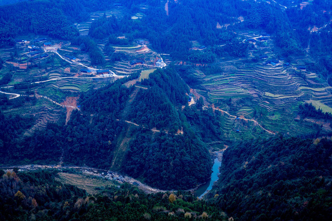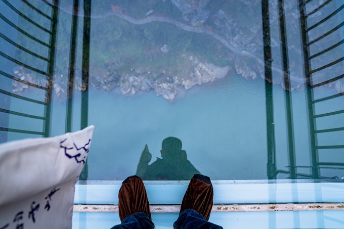 龙凤玻璃观景平台是穿岩山另一处网红打卡点,与前面的玻璃桥不同,玻璃观景台从山顶高处直接延伸出去,脚下就是万丈深渊,既然是观景平台,这里的景色自然旖旎多彩,一层层的梯田十分的壮观,远山如黛,如诗如画。