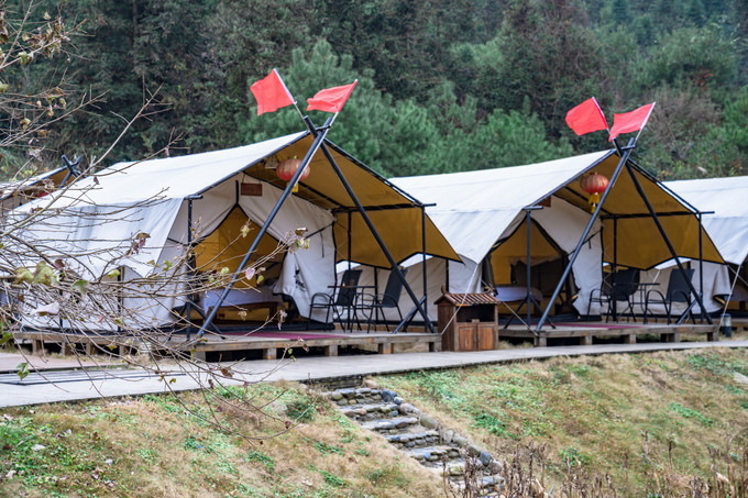 户外帐篷特别的抢眼,毕竟是在大山里面,冬季的室外温度虽然没有零下,但体感也十分的寒冷,不知道住在帐篷里是什么样的感觉,帐篷里面的硬件设施都很齐全,最重要的是保暖设备,听住在帐篷里面的游客讲,住在帐篷里还是十分有趣的。