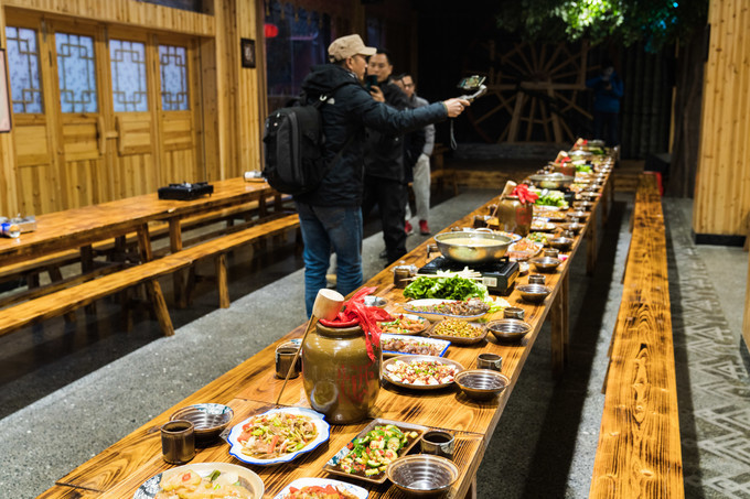 晚上少不了一顿侗族特色的吃合拢宴,一个寨子来了共同的贵客,而客人又不能久留时,主方每户来一成年男子,各尽其所有,共同筹办酒席并陪餐,谓之吃合拢宴。他们根据各自的家庭情况,把自家好吃的拿出来,或开坛取腌鱼腌肉,或杀鸡杀鸭,或炒猪、羊、牛肉,或炒鸡、鸭、鹅蛋,或炒雀子肉和野兽肉;自带甜酒、泡酒或烧酒以及粘米饭、糯米饭、粳禾米饭、糍粑、小米粑等一起来陪客人。合拢宴一开始,首先由家长、族长、寨老端杯致欢迎辞,之后宴会才开始。