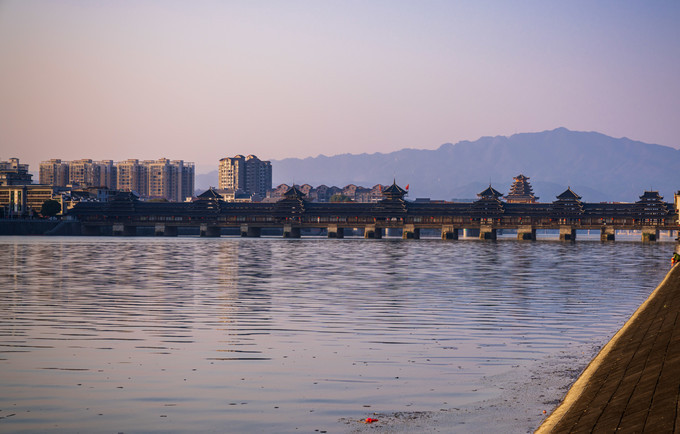 除了受降纪念坊,芷江还有一座当今世界上最大的风雨桥——龙津风雨桥。桥身全长146.7米,宽12.2米。人行道宽5.8米,长廊两侧共设厢房式店面94间,隔间建有7处凉亭,亭最高17.99米,抚扶木栏,登上观赏亭,舞水两岸风光尽收眼底。明山叠翠,舞水拖蓝,犹如一幅流动的山水画卷,令人神往,浮想联翩。整个风雨桥为全木质架构,无一钉一铆,气势宏大,如一条长龙横惯东西两岸。