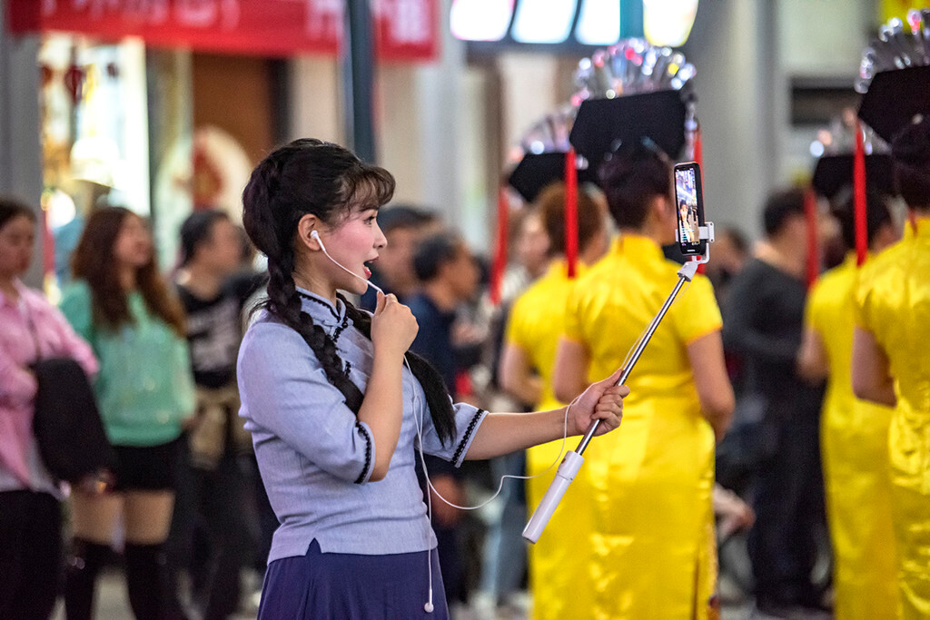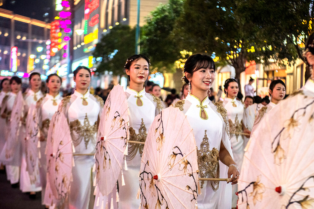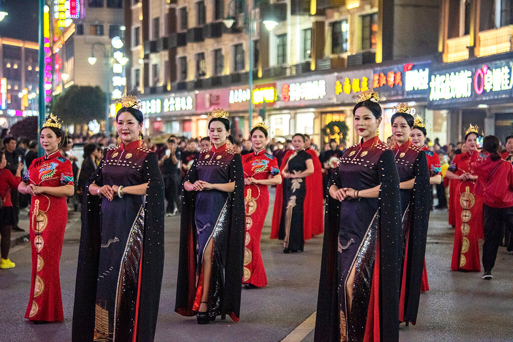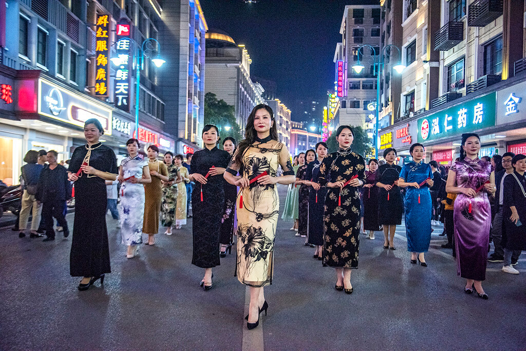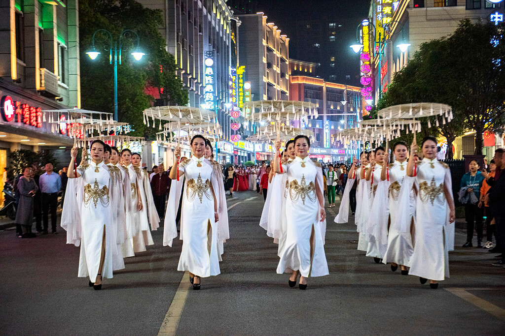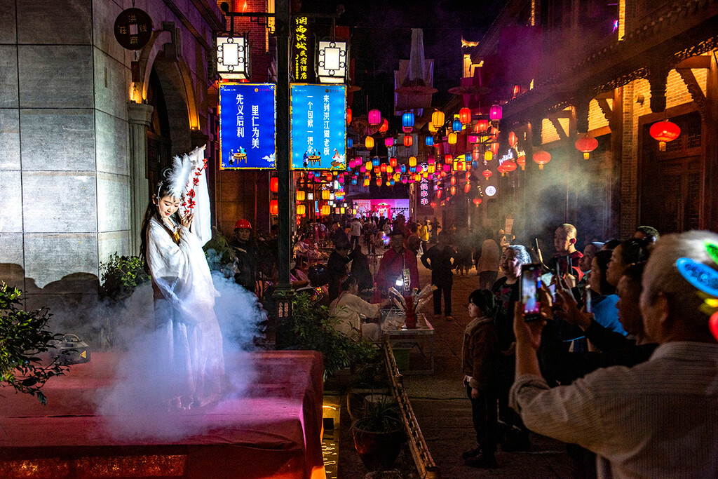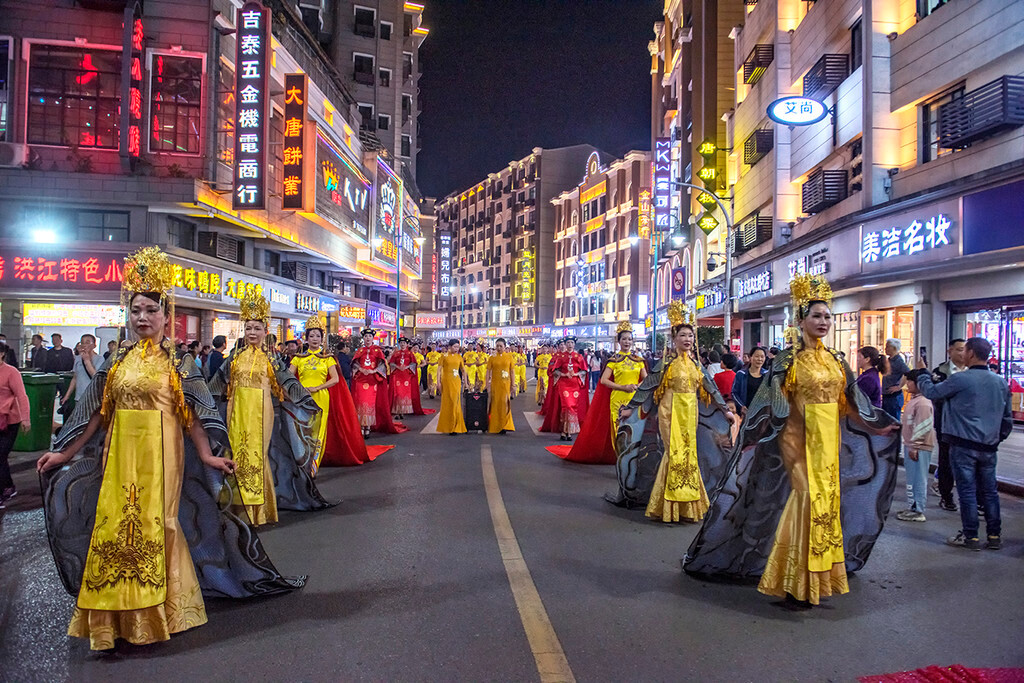 夜晚的洪江古商城,流光溢彩,灯火璀璨,我们到的时侯正好是周末,还赶上国内首创以“又见小城故事”为主题沉浸式夜游活动。夜色中,在熟悉的“小城故事”的音乐声中,身穿古典旗袍或汉服的佳人尽显娇艳婀娜,还有手执羽毛扇的“民国”女子们粉墨登场,不经意间,总有种上海滩风云再起的错觉。