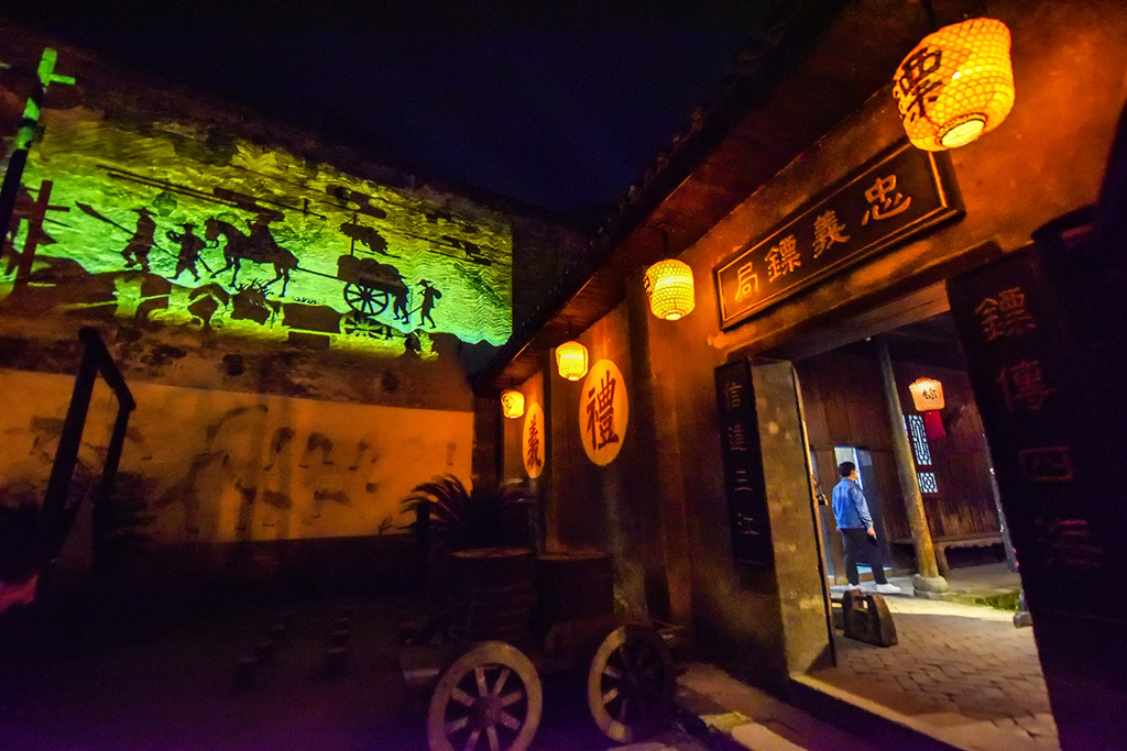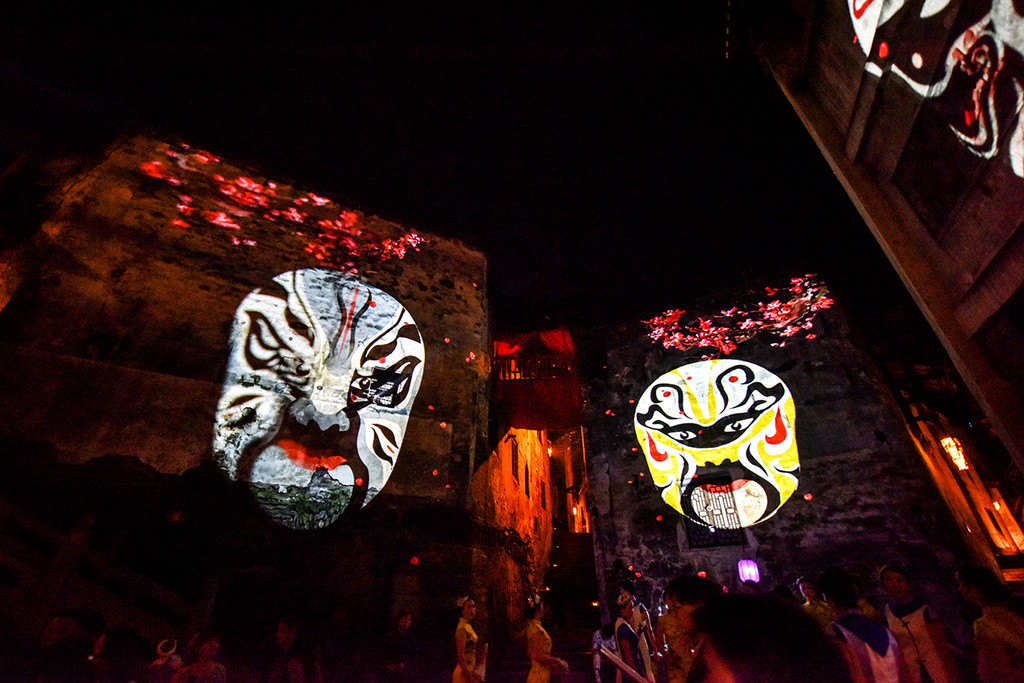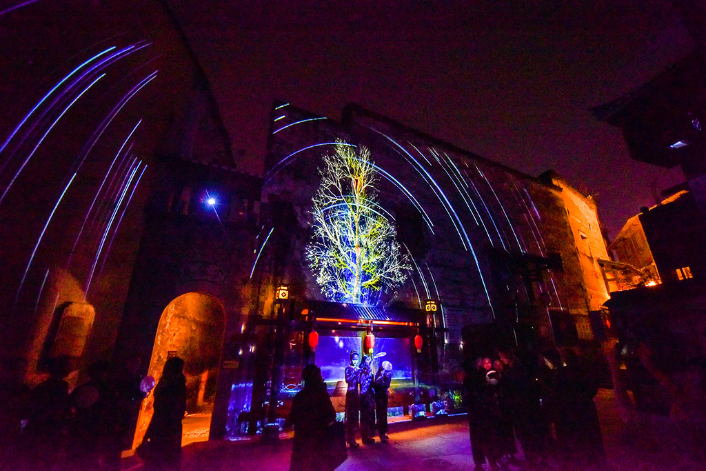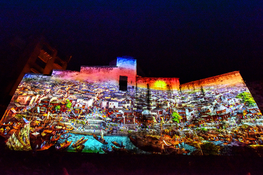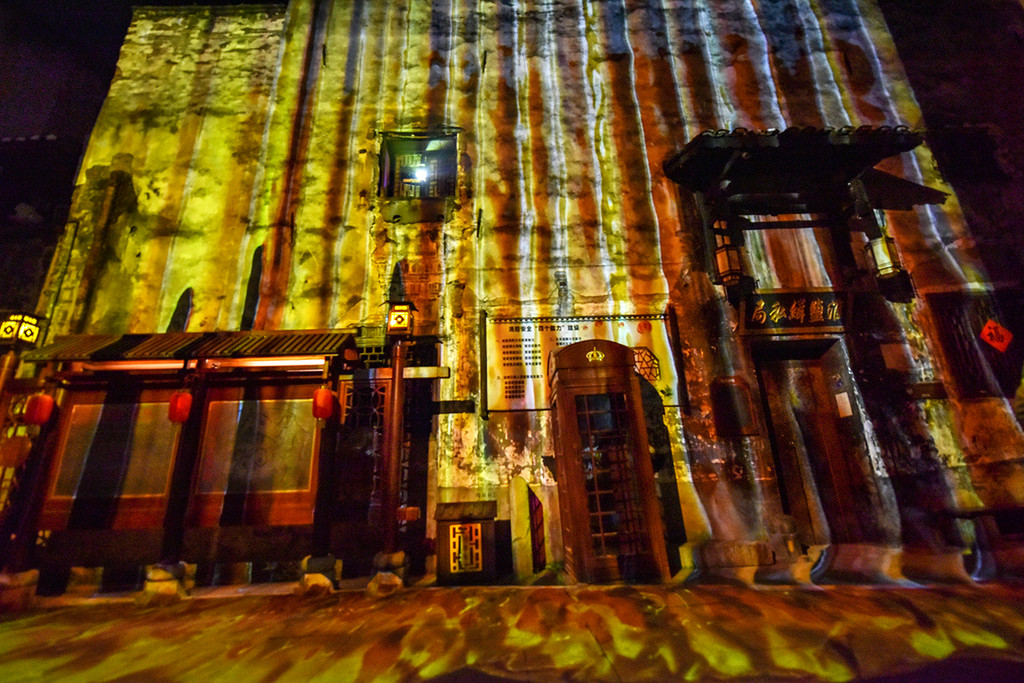 文创灯光秀是一场古老与现代的交织艺术秀,沧桑古墙为布,绚丽灯光为墨,浓墨重彩的动态灯光,绚丽的景观灯光美仑美奂。随着画面变换,明清时期商贾重镇洪江列肆如云、会馆林立的盛景再现,千年古商城的“前世今生”娓娓道来,犹如一幅直观的明清社会市井全貌的“清明上河图”。