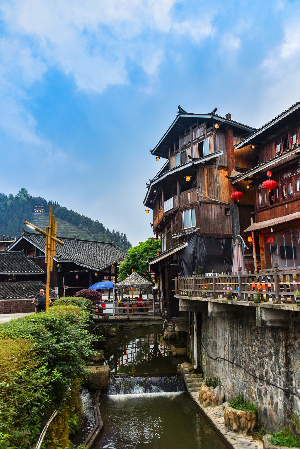 皇都历史悠久,古色古香、民风民俗完整、原汁原味,我们现在看到的皇都侗寨,由头寨、盘寨、尾寨三大连为一体的寨子,以及一个处于半岛之上的新寨这4大部分共同组成,它山体环绕村寨四周,形成了“三水抱四寨、三宅共一场、四寨成盘龙”的独特居住环境。走进皇都侗寨,远处的山峦层层叠叠,雄伟壮观,近处的河水如翡翠般闪着绿色的光芒,天蓝、云白、山清、水绿,整个人都觉得神清气爽。