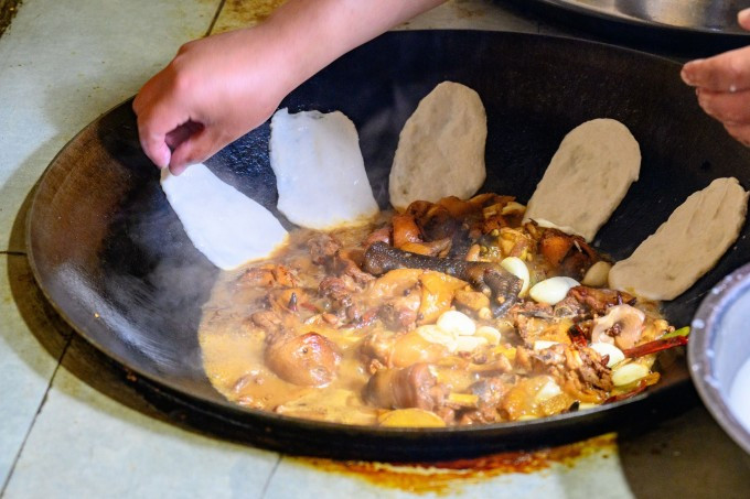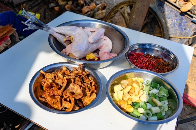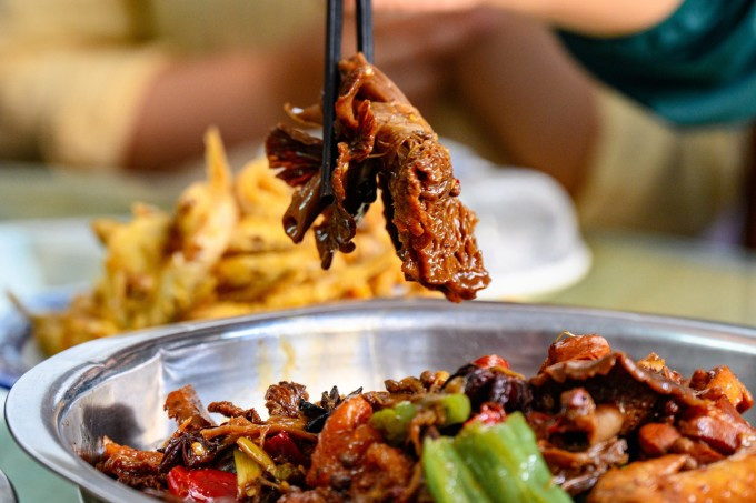 蘑菇鸡食材选用的是皇藏峪野生蘑菇和散养土公鸡,经柴火锅烹饪而成,味美鲜嫩、麻辣鲜香,甚至有着“不吃蘑菇鸡,白到皇藏峪”一说。因为土灶台就在饭店门口,食客来这里可以看到整个蘑菇鸡的制作过程,和地锅鸡有些相似,但还是略有不同。(ps.个人感觉真是超级入味,我觉得蘑菇比鸡肉还好吃!)