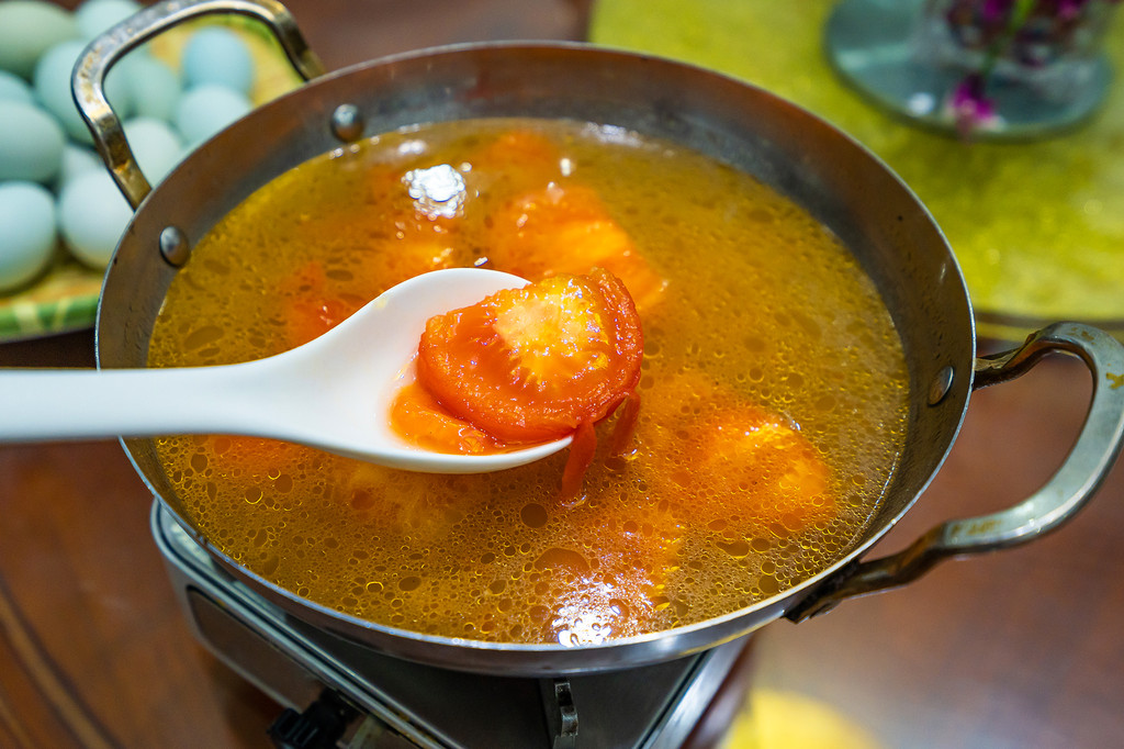 这里的黑羽乌骨鸡蛋也是远近闻名,被誉为“鸡蛋中的人参”,吃法比较特别,会先上一份西红柿汤,吃的时候是直接把蛋打进锅里,百分百保证鸡蛋的鲜美能被食客第一时间品尝到。