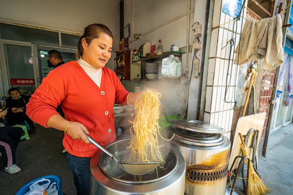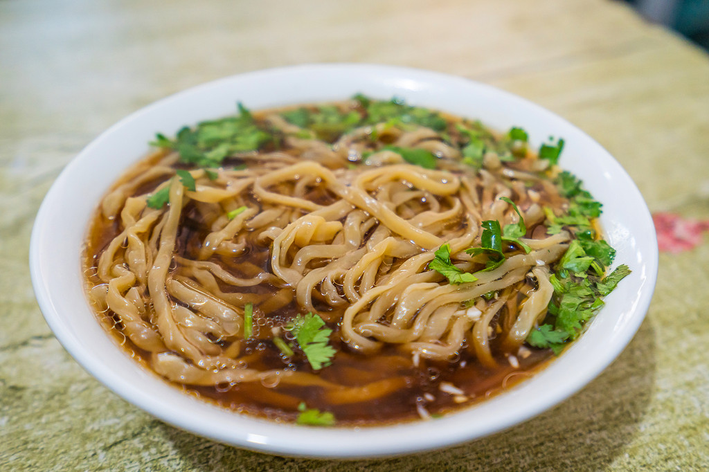 寿县古城的小刀面,在当地非常有名,它是大的面皮压实后用刀切成细细的条,切出来的面条大概4-6mm宽,放入滚水中稍加汆烫即熟,因此面条根根分明,口感特别爽滑劲道~