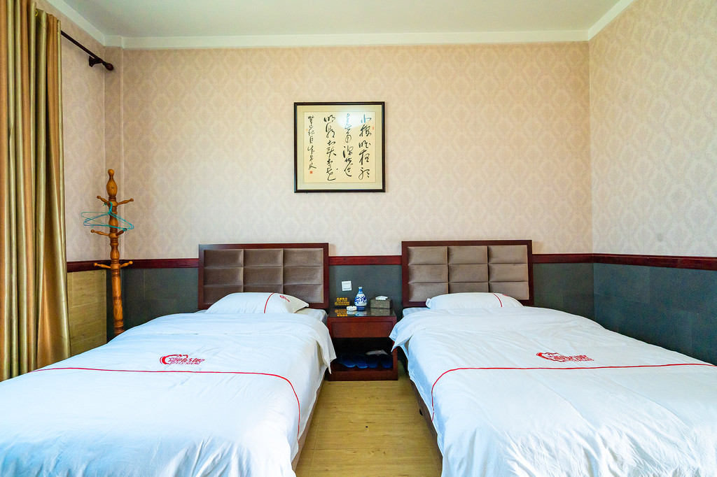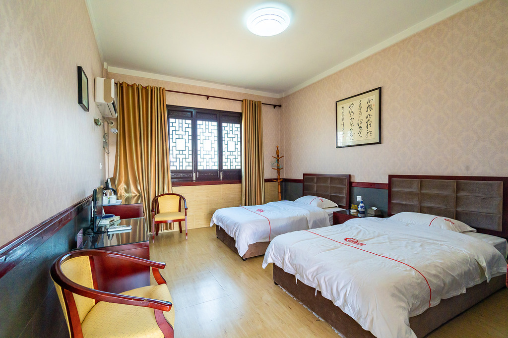 民宿的房间干净整洁,新中式的设计风格典雅大气,花窗的装饰,墙面还有一些书法字画,给房间增添几分历史文化气息。洗漱用品和吹风机也一应俱全。推开房门就是堰口秋天美丽的田园风光,呼吸着的都是清新的空气,住进这里真的一下子就放松了下来。