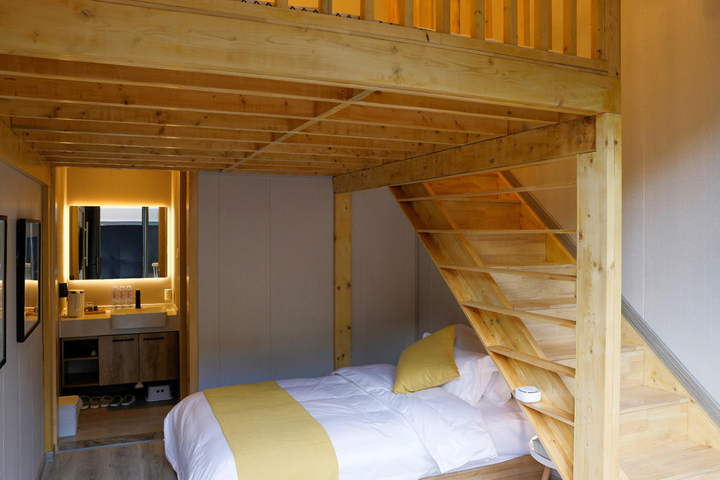 棉花糖和跳跳糖在两边,主人精心设计成LOFT式结构,上下两层动静分离,纯木质构造极具匠心,温馨又自然,非常适合家庭亲子度假。