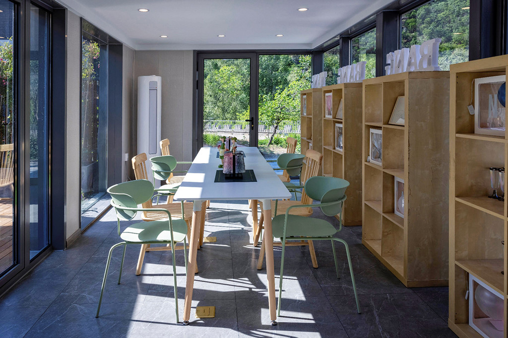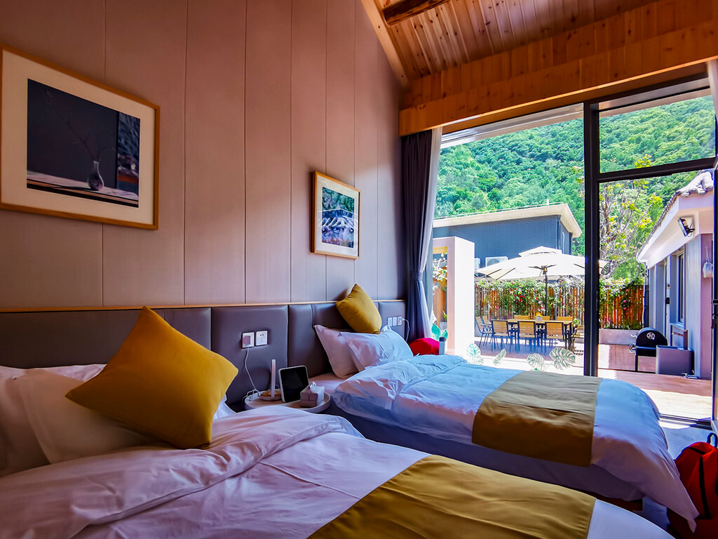 彩虹糖在中间是一间亲子双床房,三口之家同住幸福又快乐。小院客房均采用全景式落地大窗,室外景观一览无余,躺在床上看云启山巅,夜晚数星星望月亮。