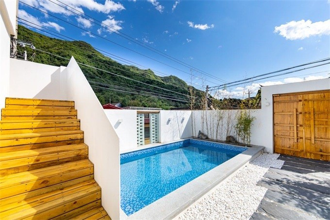 红螺寺62号民宿它颜值比较高,庭院内配了泳池,虽然不是很大,但是愉快的玩耍够了,附近可爬山、采摘、野餐,晚上在院内听着音乐,约上闺蜜在泳池里拍照简直了。