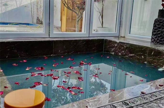民宿室内设计了大的汤池可以泡私汤,水温特别合适,泡一会会微微出汗,相当舒服!大落地窗设计,还可以边泡私汤边欣赏对面的山景,简直不要太惬意了!品一杯红酒,泡泡私汤,随手一拍也是大片即视感,燃爆您的朋友圈!