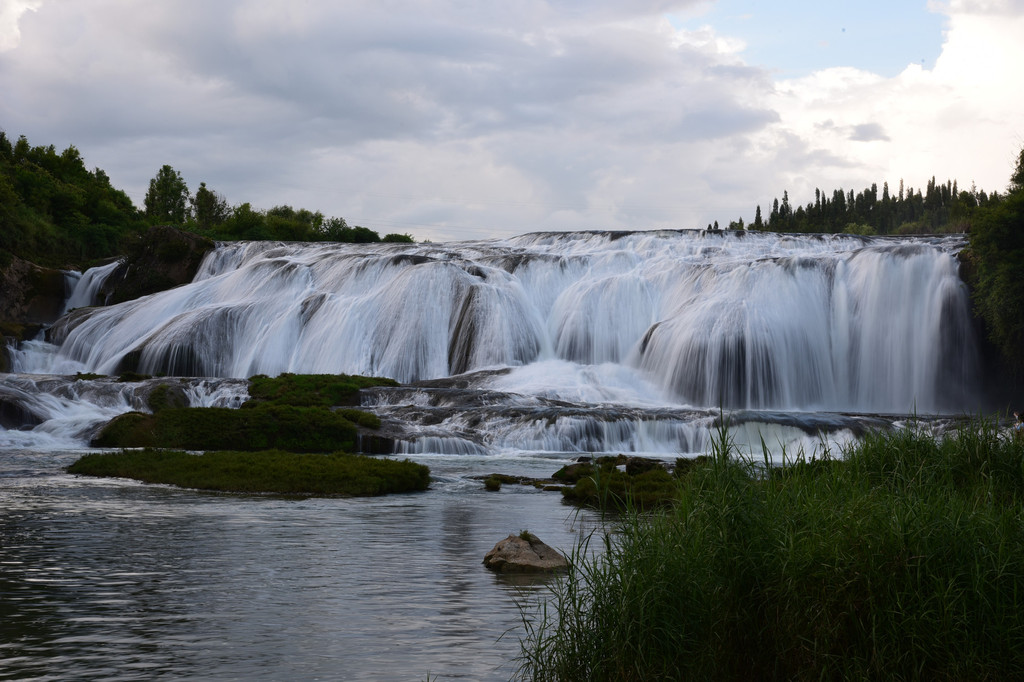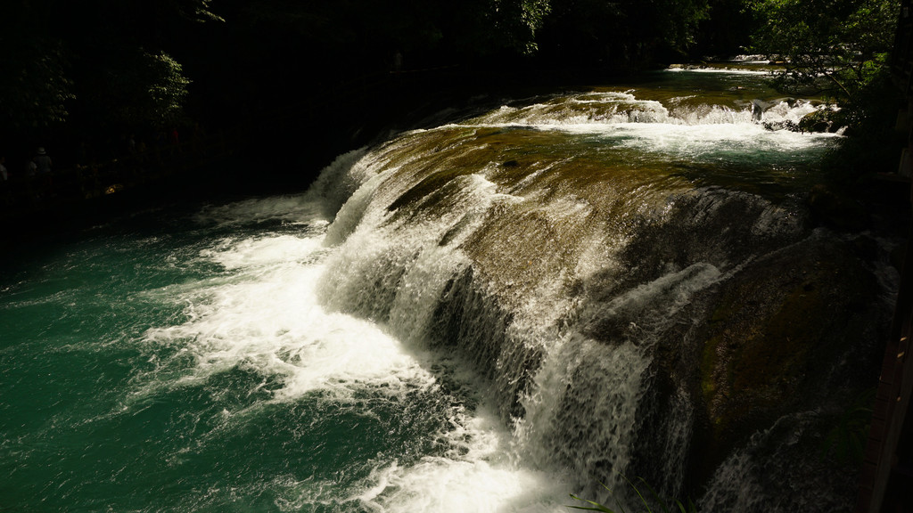 天星桥景区出来,去陡坡塘。陡坡塘瀑布位于黄果树大瀑布上游1公里处,瀑顶宽105米,高27米,是黄果树瀑布群中瀑顶最宽的瀑布。傍晚时分,游人陆续散去,喧闹一天的景区慢慢变得空旷起来,夕阳照在瀑布上,瀑布微微泛着白光。陡波塘瀑布展现了柔美的一面(图17)。