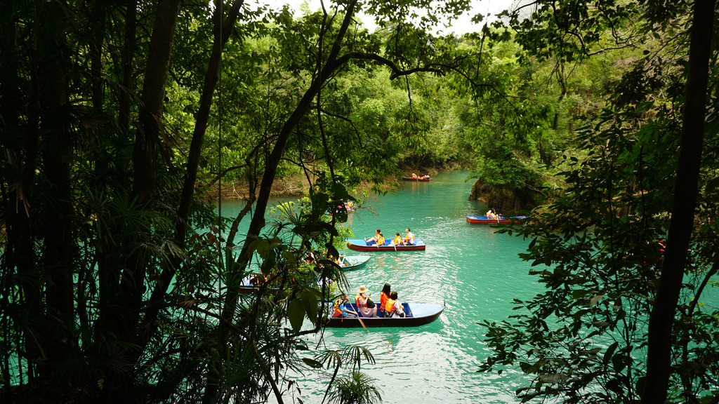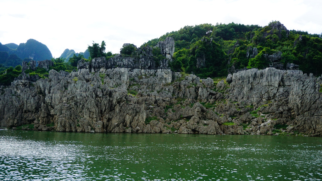 下午继续翻山越岭来到万峰湖,初入眼帘的是万千林立的石笋。坐船游湖,湖四周万峰环绕,无论岸边还是湖面怪石嶙峋,水中倒影动摇飘忽,如梦恍惚。