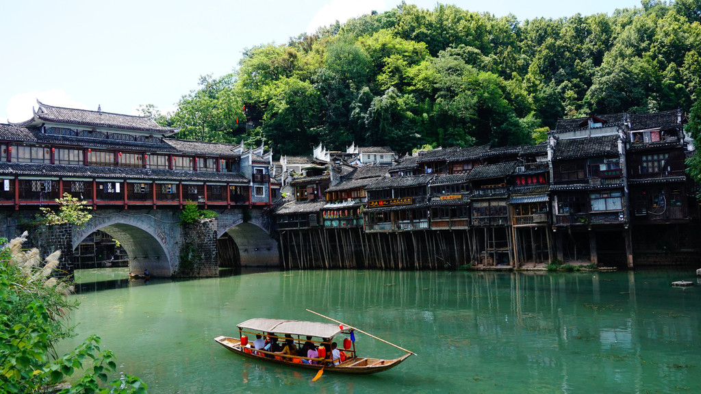 28日上午开车进入凤凰古城,漫步沱江岸边的古道,走过沱江上的跳岩来到对岸的北门城楼。古城楼两端沿江岸筑有紫红色砂石垒成城墙,城墙有东、北两座城楼,久经沧桑,依然典雅不失雄伟。城墙边的河道很浅,水流悠游缓和,可以看到柔波里招摇的水草,我们从旁边的木石桥折回,在江中来回浏览两岸的美景。
