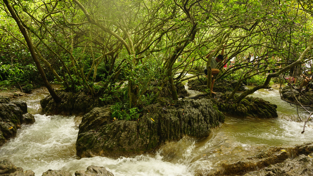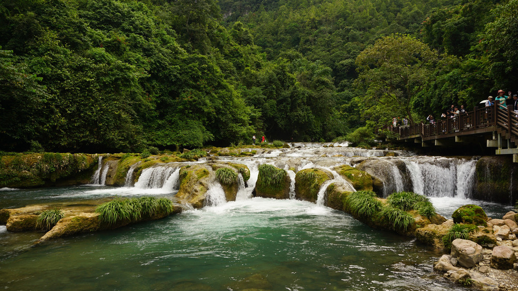 天星桥是一个岩溶地貌公园,整个景区山水树木奇佳,犹如天然的大盆景园,过天星桥,出天星洞,就是冒水潭,河床跌宕形成许多小瀑布。接着就是的银链坠瀑布。上游的小瀑布汇合到此后,水流沿着巨石粗糙的表面轻盈地漫过,均匀铺开,然后缓缓地汇聚在底部深潭里,如千万大大小小的银链轻轻嚷嚷地坠入深潭。阳光下,水流更仿佛披上一层银纱,晶莹剔透,皎洁柔美,让人有种误坠银河的错觉,不舍离开(图16)。