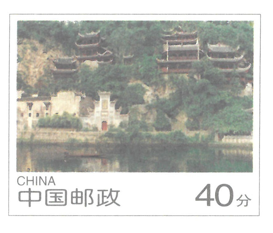从袁家界百龙天梯下山,来到十里画廊。一天的行走让人感觉疲惫不堪,就坐景区小火车欣赏三姐妹峰、采药老人、全家福、食指峰、驼骆峰等奇峰。只是邮票小型张的主图位置我还是没能找到。当年设计这套邮票的许彦博老师为了核对小型张原图,跨过一条小溪而且以摔倒在溪中的代价才找到,可见不是在寻常旅游路线上可以看到的。我等匆匆过客,也就只能到此打卡了。后来,我拜会许老师,当面求证。许老师告诉我:这是在景区入口处的风景。因为在邮票上表现的是山峰,所以在小型张上特意融入溪流的因素(图33)。