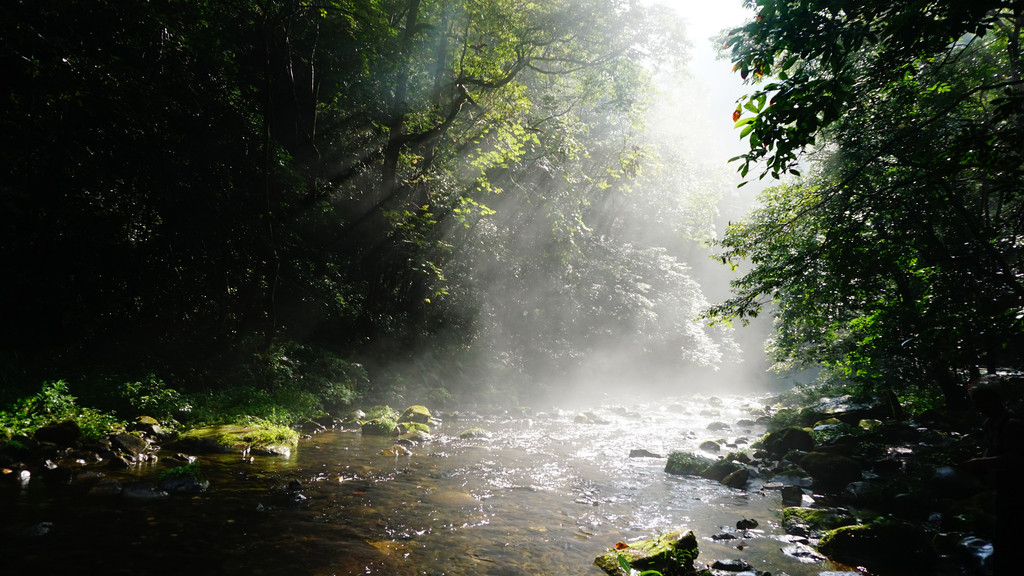 8月7日上午,走进“山水画廊”金鞭溪。刚入山谷时还是艳阳高照,走不多远,忽然邂逅一场大雨,游人纷纷往回走,如作鸟散。尚大的山谷顿时变得空荡起来。我们继续沿石板游道顺溪前行,两边千峰耸立,高入云天;溪旁树木繁茂。行约3公里,太阳又从云中挤出,阳光透过树林间隙照在溪流上,投射出一道一道光柱。薄雾从溪流里缓缓升起,氤氲如画(图34)。感觉比《武陵源》邮资明信片上的金鞭溪图片还美。很多活泼的猴子在树林里嬉戏,有的在树梢上跳跃,有的走到游客面前,伸出爪子要吃的。也有淘气的的从树上直接跳入溪中游泳……增添几许乐趣。