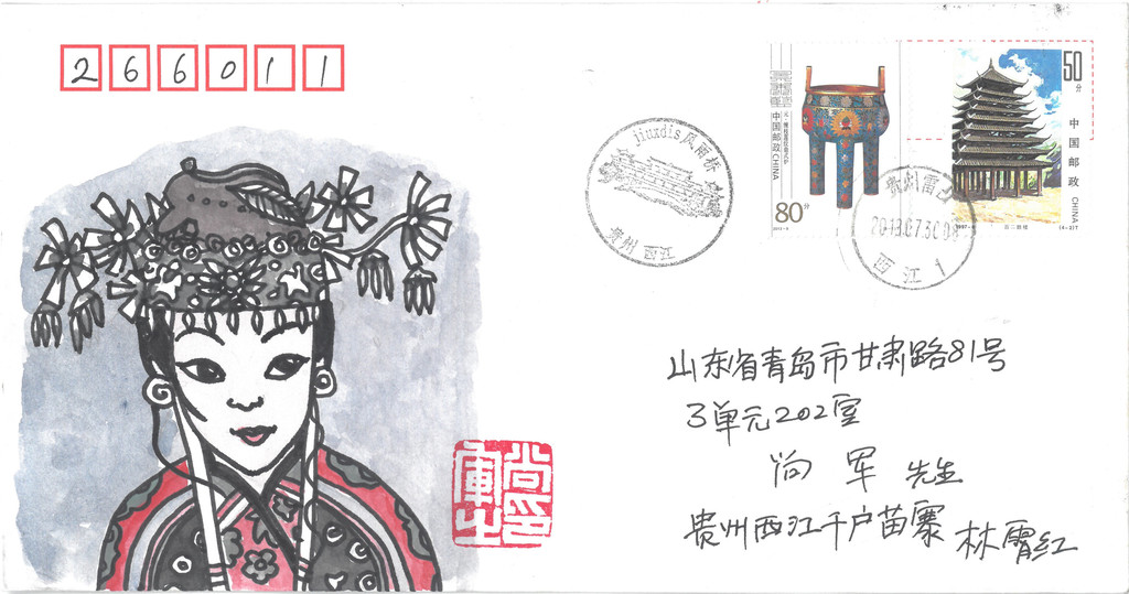 30日上午,坐景区公交到苗寨,这里群山环抱,层峦叠翠,一条小溪从雷公坪而来,穿寨而过。五座风雨桥横跨在溪上,木质吊楼依山而建,暗红色的枫木板壁在阳光下一片金黄,颇为壮观。苗寨里设有中国苗族文化主题邮局(图9),连摆在门口的邮筒也是苗寨的鼓王造型。里面有苗族风情明信片出售,并有不少风景邮戳可供游客加盖。给朋友寄了一批明信片和手绘封(图10,11,12)。在寨子里欣赏阵容颇为强大的苗族风情演出后(图13),告别苗寨,开往荔波。
