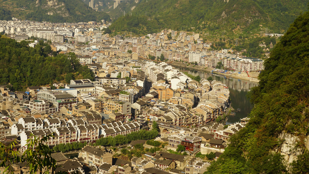29日一早登上石屏山,清晨的山上云雾缭绕。苗疆长城盘踞在山上。从石屏山上往下看,舞阳河蜿蜒以"S"形穿城而过,北岸为旧府城,南岸为旧卫城,远观颇似太极图。群山环抱中的镇远城。下山不远处就是曾经出现在《贵州风光》邮资明信片上青龙洞古建筑群(图7)。整群建筑靠山临江、依崖傍洞、贴壁凌空、勾心斗角,错落有致,有“西南悬空寺”之称。在吊脚楼临河远眺,水面绿漪涟涟,碧澄如玉(图8)。