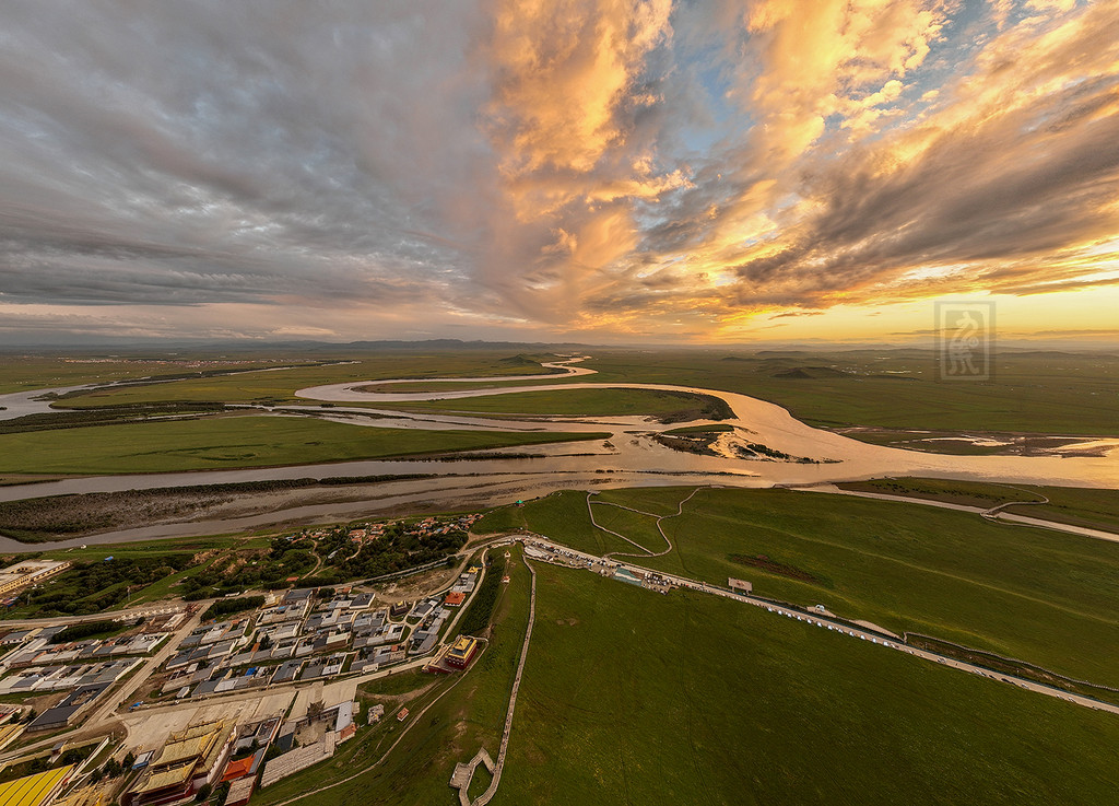 在太阳即将下山的时候,乌云终于如愿地逐渐散去了。一束金色的丁达尔光刹那间刺破云层,和煦地照在这片土地。近处的寺院,远处的土丘,曲折回环的河流和广袤草原都被金色的阳光勾勒出来,呈现出迷人的立体感。我们在黄金一小时的最佳十五分钟,邂逅了九曲黄河的最美时光。那一刻,时光仿佛停滞,大片云层倒映在黄河缓缓流淌的水面,与漫天云端精妙的融合在一起。