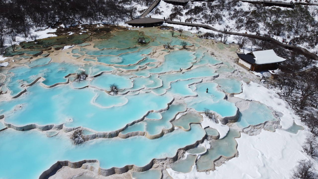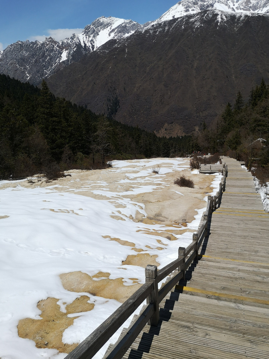 黄龙海拔比较高飞无人机耗电比较快。由于现在是枯水季,除了五彩池其他景几乎没有多少水但是因为我们去之前下了一个礼拜的雪就当看雪景了。