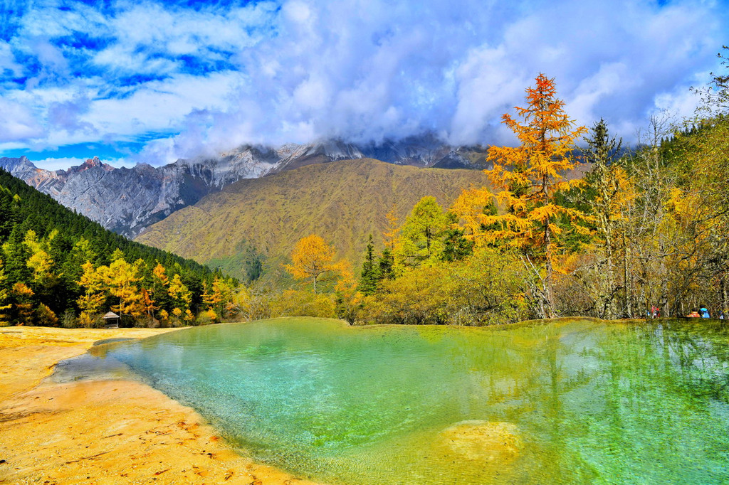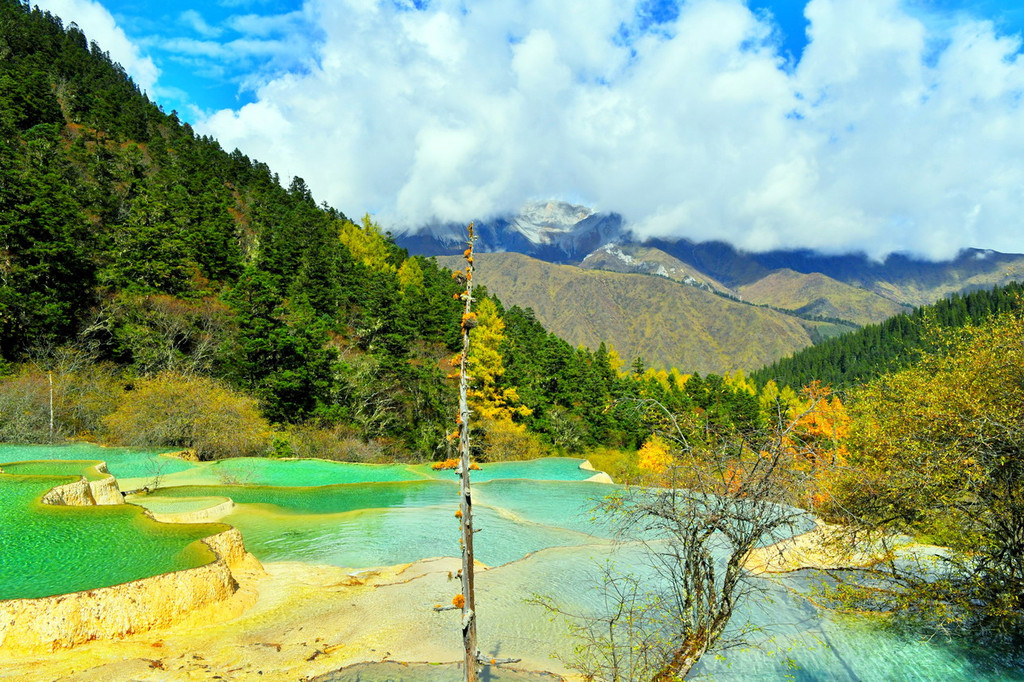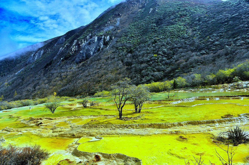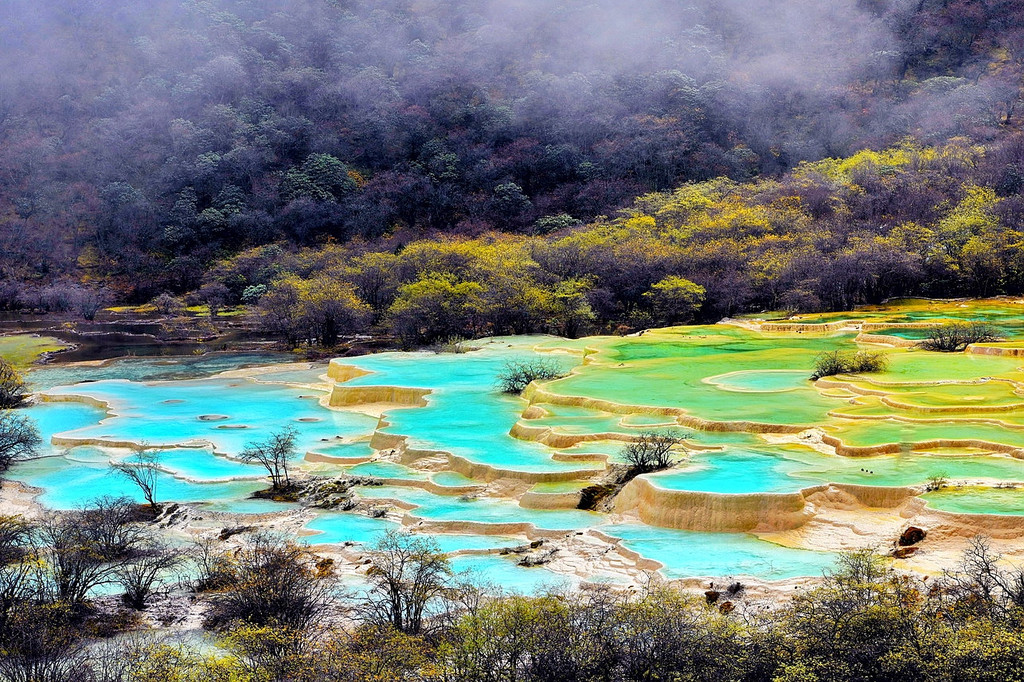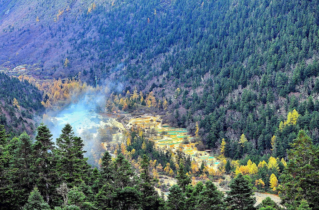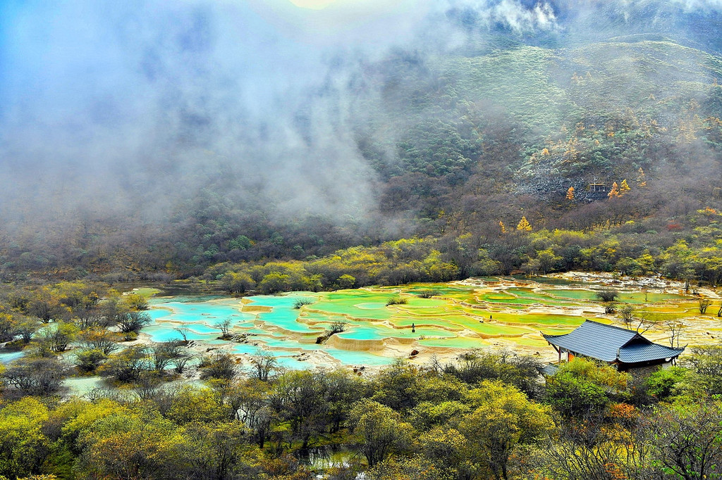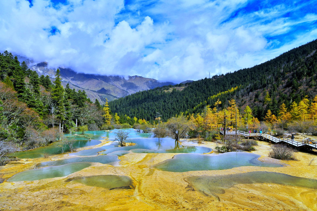 深秋季节,在玉树琼花的映忖下,彩池碧蓝如玉,诡谲奇幻。池坝形态各异,有弧形、扇形、裙边形等,排列参差错落,层叠而上,似一幅立体油画,象一首无言情诗,彩色斑斓的“五彩池”俨然成为黄龙景区最亮丽的景观。
