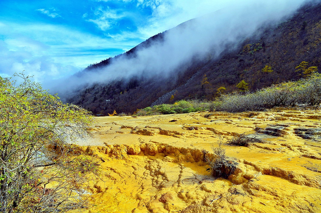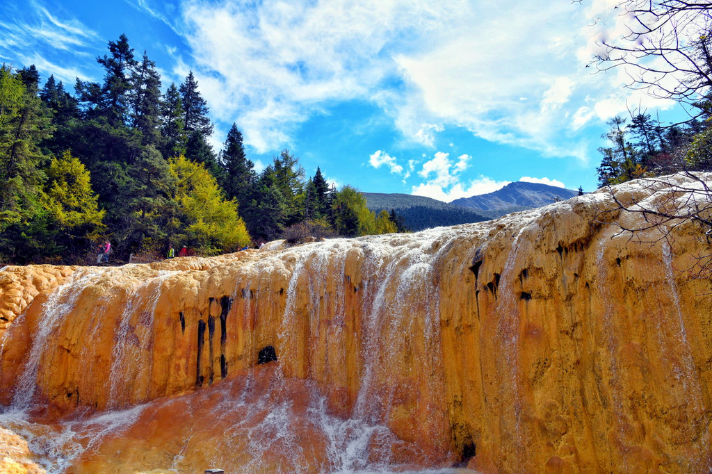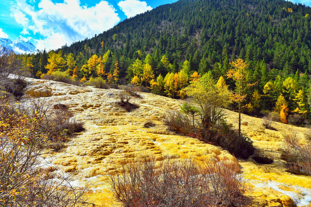 前往涪源桥的下山途中,总有一条湍急的黄色山水相伴,这就是“金沙铺地”景观了。由于碳酸盐在这里失去了凝埂成池的地理条件,因此漫坡的水浪,在长长的脊状斜坡地上翻飞,并在水底凝结起层层金黄色钙华滩,好似片片亮丽“鳞甲”,在阳光照耀下发出闪闪金光,成了黄龙的又一罕见奇观。