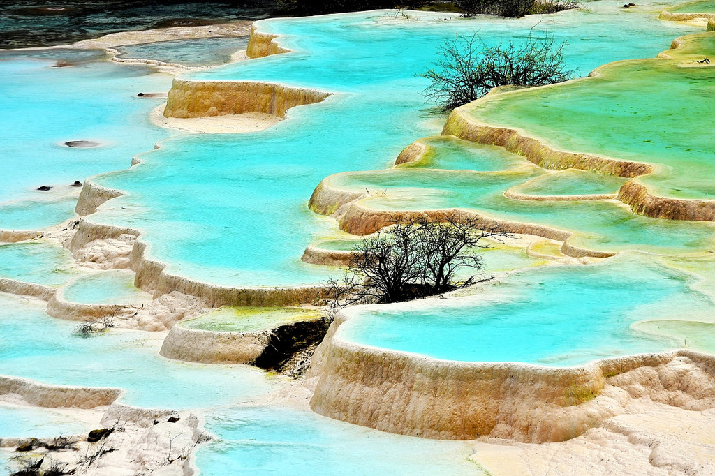 这是一片密集的彩色景观,紧傍森林的明镜倒影池、掩映于杜鹃花丛间的婆萝彩池和拥有彩池500多个,钙化景观中色彩最为丰富的争艳池。