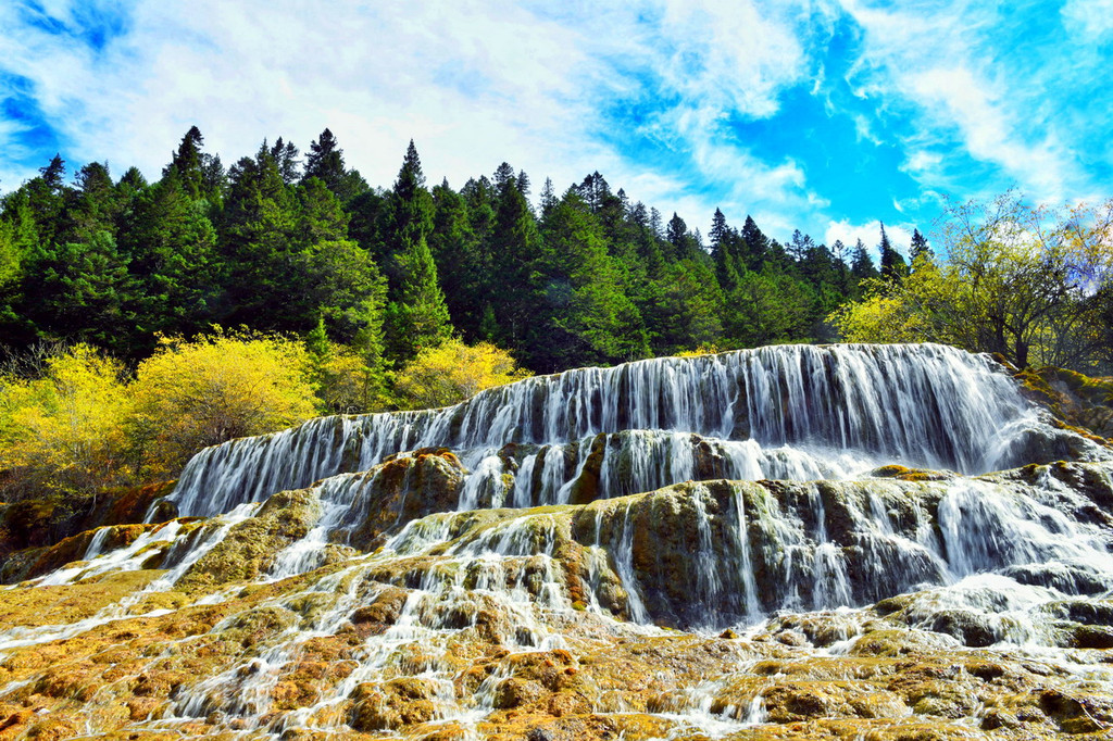 山谷里千层碧水冲破密林,顺坡而下,在高约10米~、宽约60余米的岩坎上飞泻而来,形成数十道梯形瀑布,如珍珠流滚落,银光闪烁;如水帘高挂,云雾蒸腾;如丝般缓流,舒展飘逸;如珠帘闪动,风姿绰约。瀑布凝垂欲滴地挂在色泽金黄的钙化壁上,经太阳余辉点染,反射出不同的色彩,远望如彩霞从天而降,分外辉煌夺目,因而号称"飞瀑流辉"。般缓流,舒展飘逸;如珠帘闪动,风姿绰约。瀑布凝垂欲滴地挂在色泽金黄的钙化壁上,经太阳余辉点染,反射出不同的色彩,远望如彩霞从天而降,分外辉煌夺目,因而号称"飞瀑流辉"。