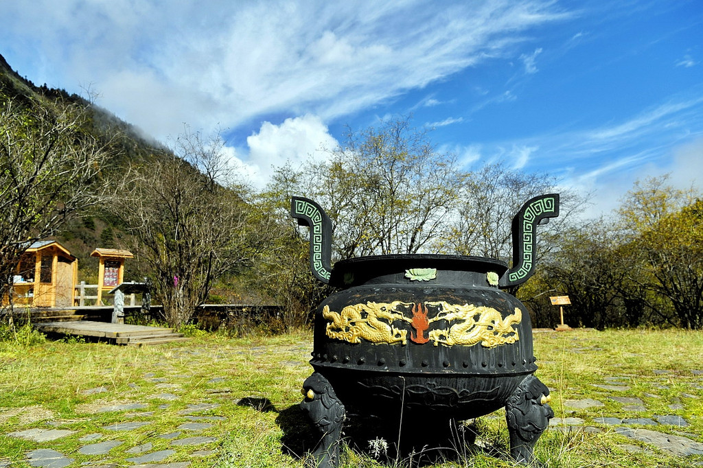 因寺庙整修,我没进入,拍完这鼎高原香炉后便顺着下山的栈道沿途欣赏山谷的彩池。