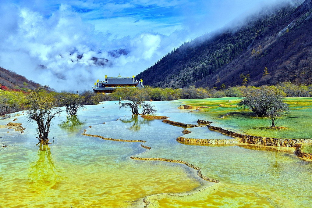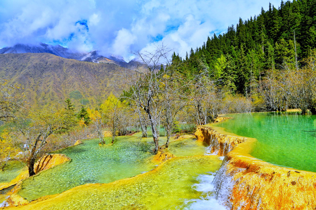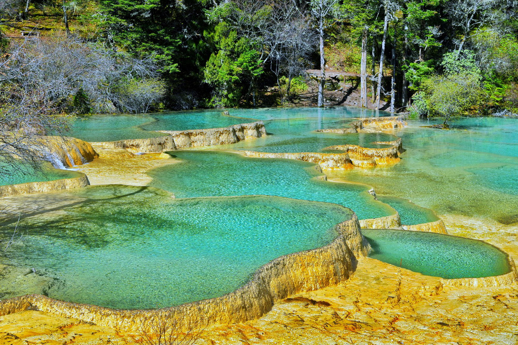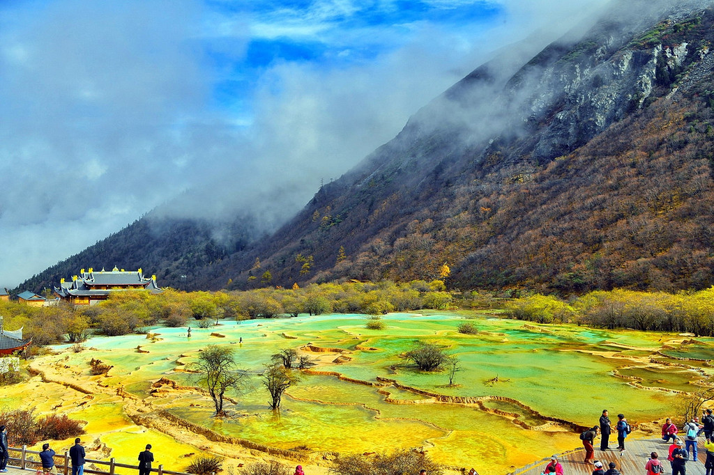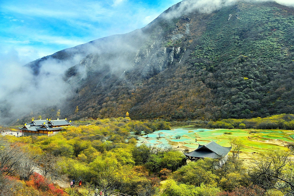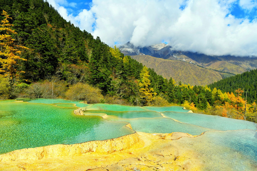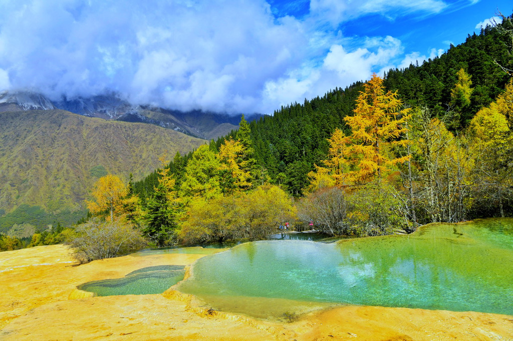 黄龙位于四川省阿坝藏族羌族自治州松潘县境内,因历经千百年岁月形成的地表钙化蜿蜒在雪山峡谷中,宛如黄色“巨龙”,故得名黄龙。进入景区原来需要翻越海拔4000多米的雪山梁子,如今通过川主寺隧道大大缩短了行程且少不高原反应。乘坐景区缆车来到山腰平地,从山顶逆向由上往下游览五彩池、黄龙寺、争艳池、金沙铺地、飞瀑流晖、洗身洞、迎宾彩池等景点,亲身体验景区“彩池、滩流、雪山、峡谷、古寺、民俗”六绝的独特魅力。