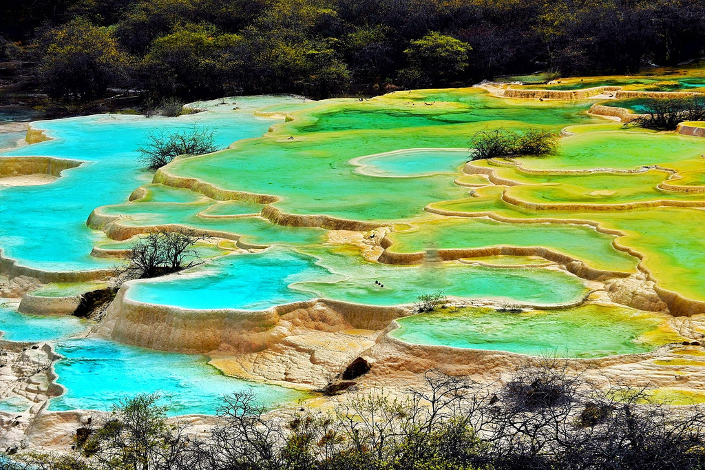 大自然的鬼斧神工带给人们太多的惊奇,几万年来,黄龙沟四周高山上的冰雪融水和地表水不断流淌下来,渗入冰碛物中,在松散的石灰岩下部形成浅层潜流,并在流动过程中溶解了大量石灰岩的碳酸钙物质。饱含碳酸钙质的潜水出露地表,形成无数小溪散流而下。