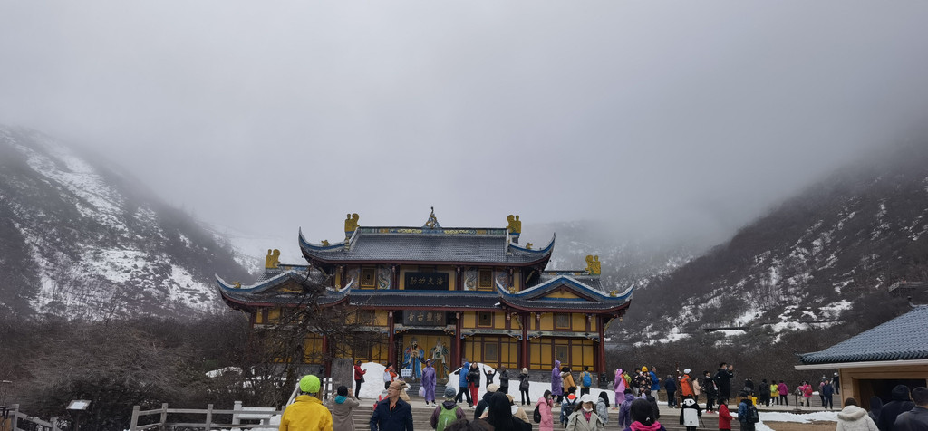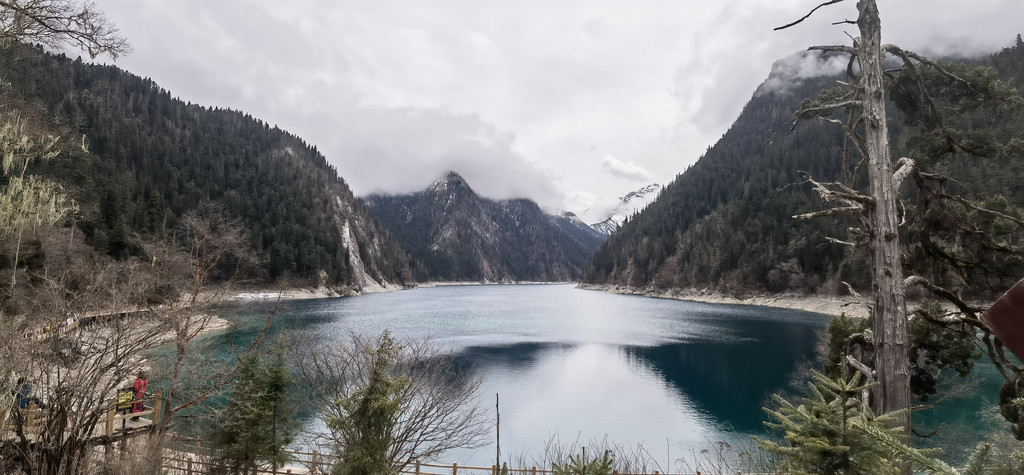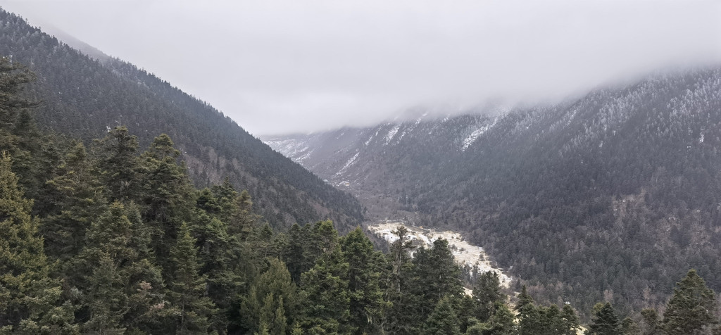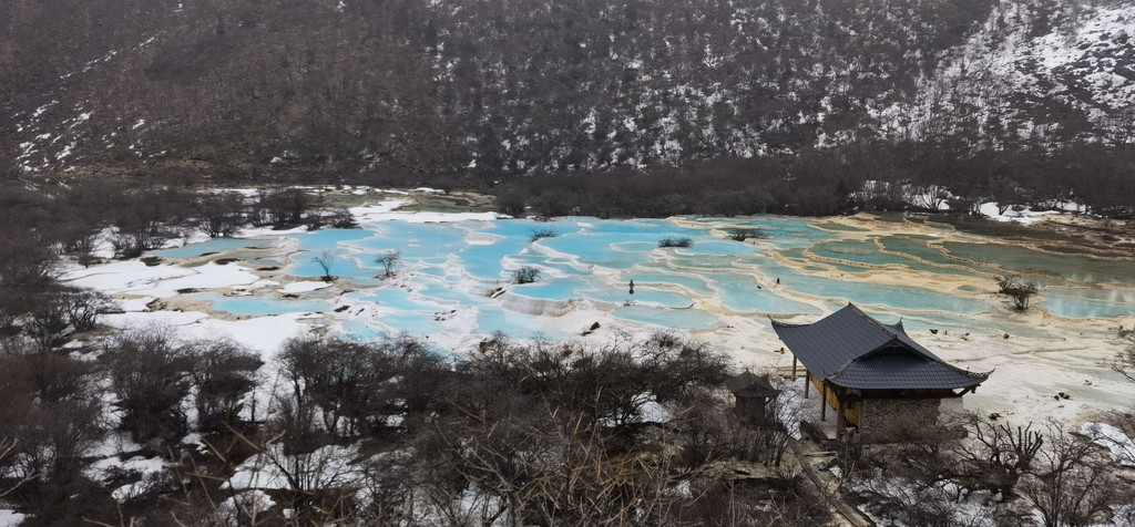 索道上山,在望龙坪上,俯看黄龙全貌:天色阴蒙,上有白雪,整个黄龙景区就在这两山之间。