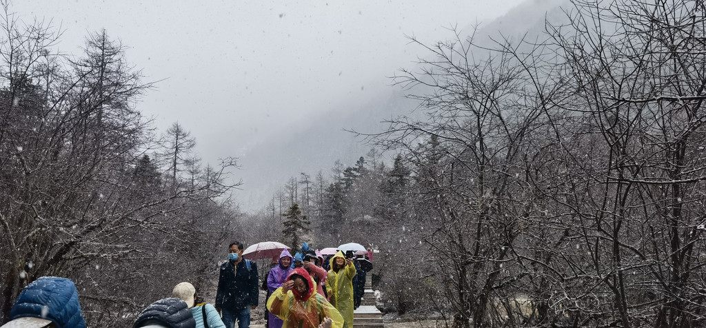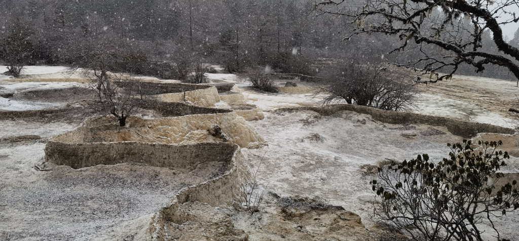 离开五彩池时,雪花从零星飘落到漫天飞舞,绿野仙踪顿时幻化成了银装素裹。
