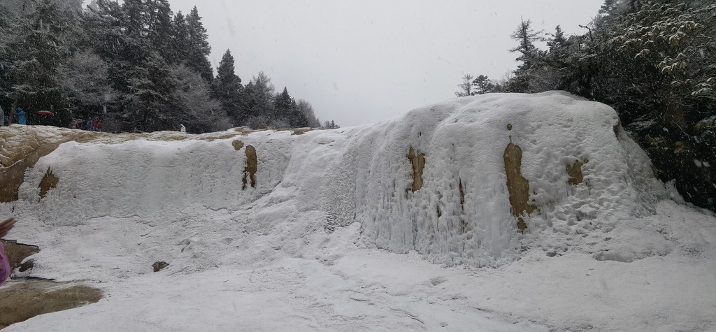 上面是金沙铺地,积雪覆盖下的雪墙还有一个洞,名叫洗身洞。