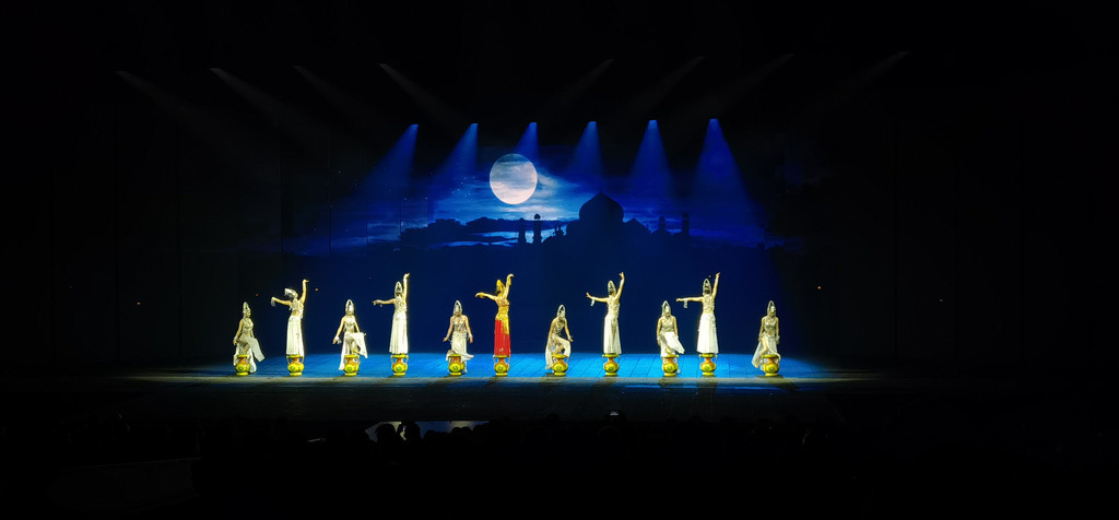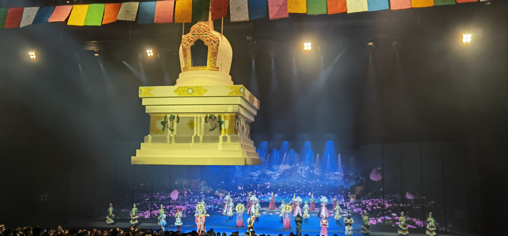 大地震灾难过后,祥和的梵音抚慰着人们的心灵。只见宏大的藏式白塔缓缓地从天而降,移动观众席两侧升起了寓意美好的莲花升降台,手持转经筒的喇嘛唱起了祷告。抬头往剧院顶上看,五彩的经幡在空中飘荡,演出在一片吉祥声和鼓掌声中落下帷幕。