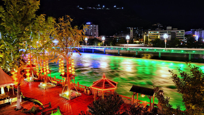 太子岭滑雪场回来的时间正好是晚上,顺便观赏了汶川的夜景,车上放着温柔感人的歌曲,望着车窗外,水流湍急冲撞着新桥,