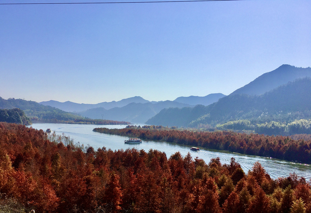 第二站方塘红彬林:门票无,主要景点:由六片红杉林组成,占地3000多亩。沿路绿水环绕,是藏在深山秀水里的江南喀纳斯风光。每年的11月中下旬,红杉林就开始变色,从青—浅黄—金黄—深红的最佳观赏期在12月20日之后。可以坐船参观,船票每人60元,或沿湖徒步观光,停车场的山上有观景台,可观看红彬林全景。