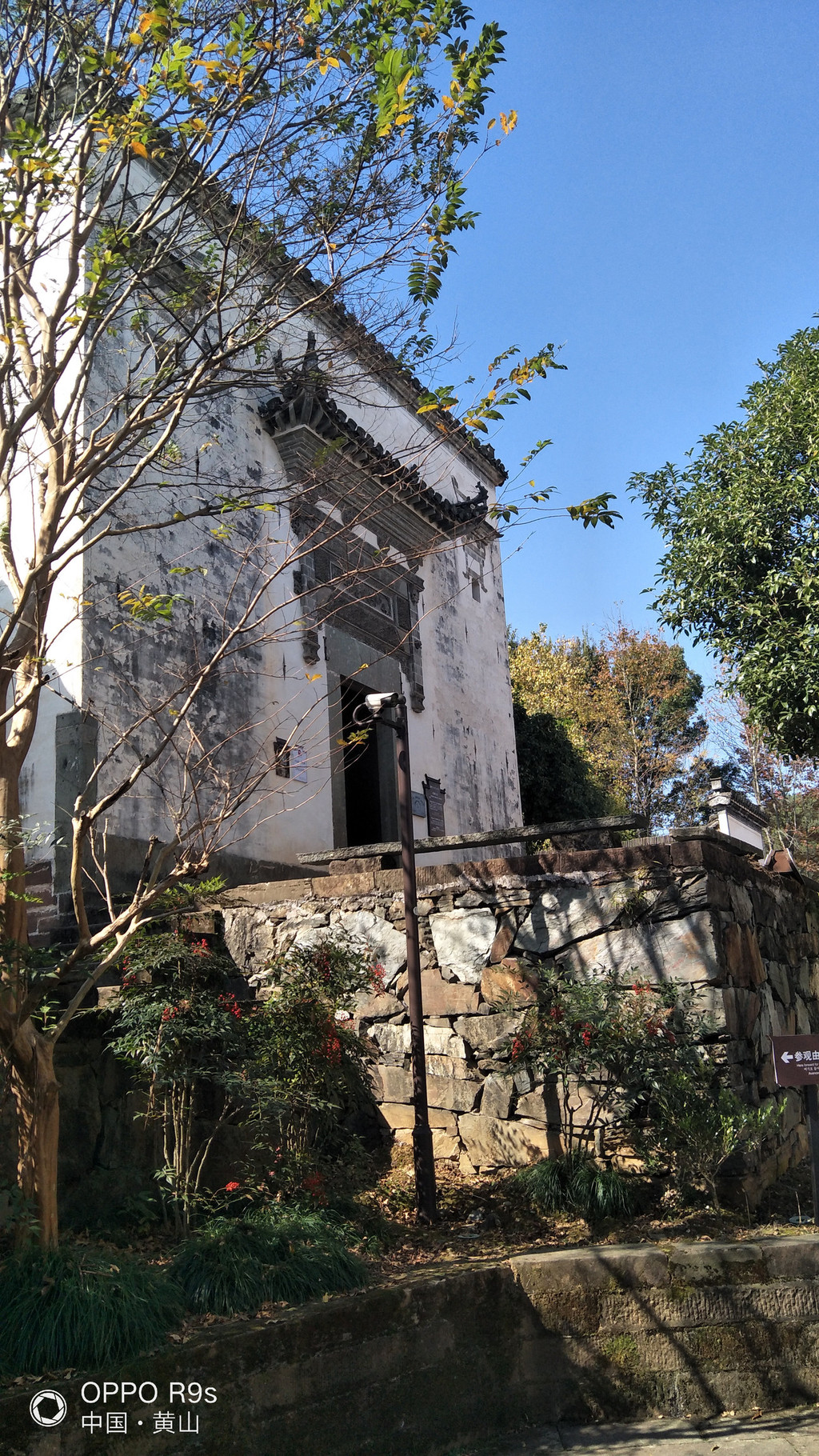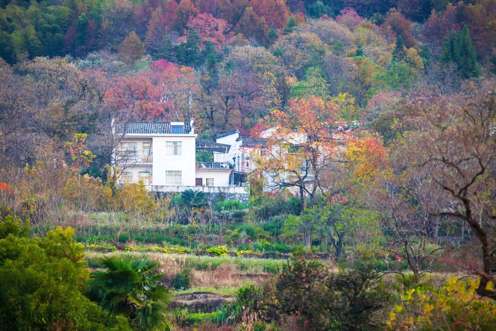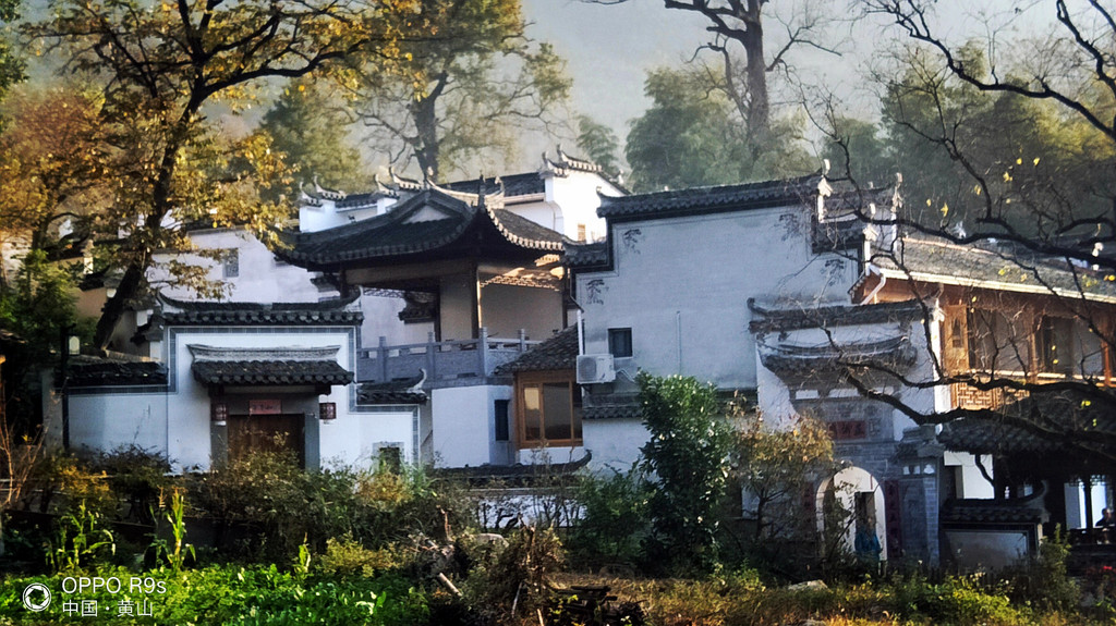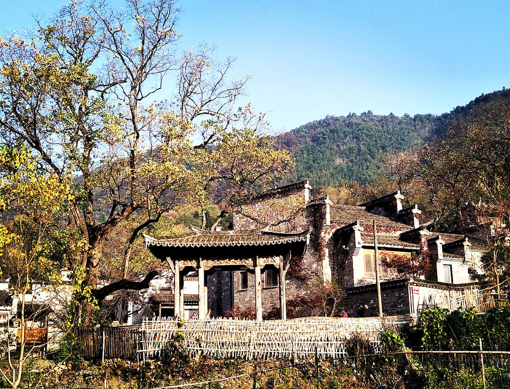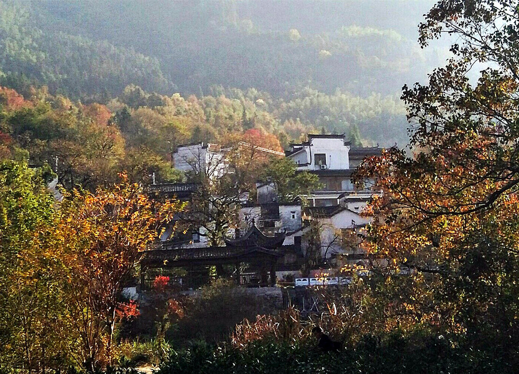 白墙黑瓦马头墙顶,典型的徽派建筑风格,再有秋季那姹紫嫣红色彩的映衬真是绝妙的搭配。
