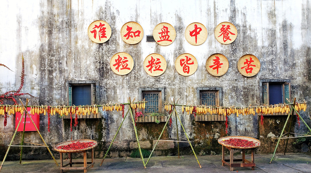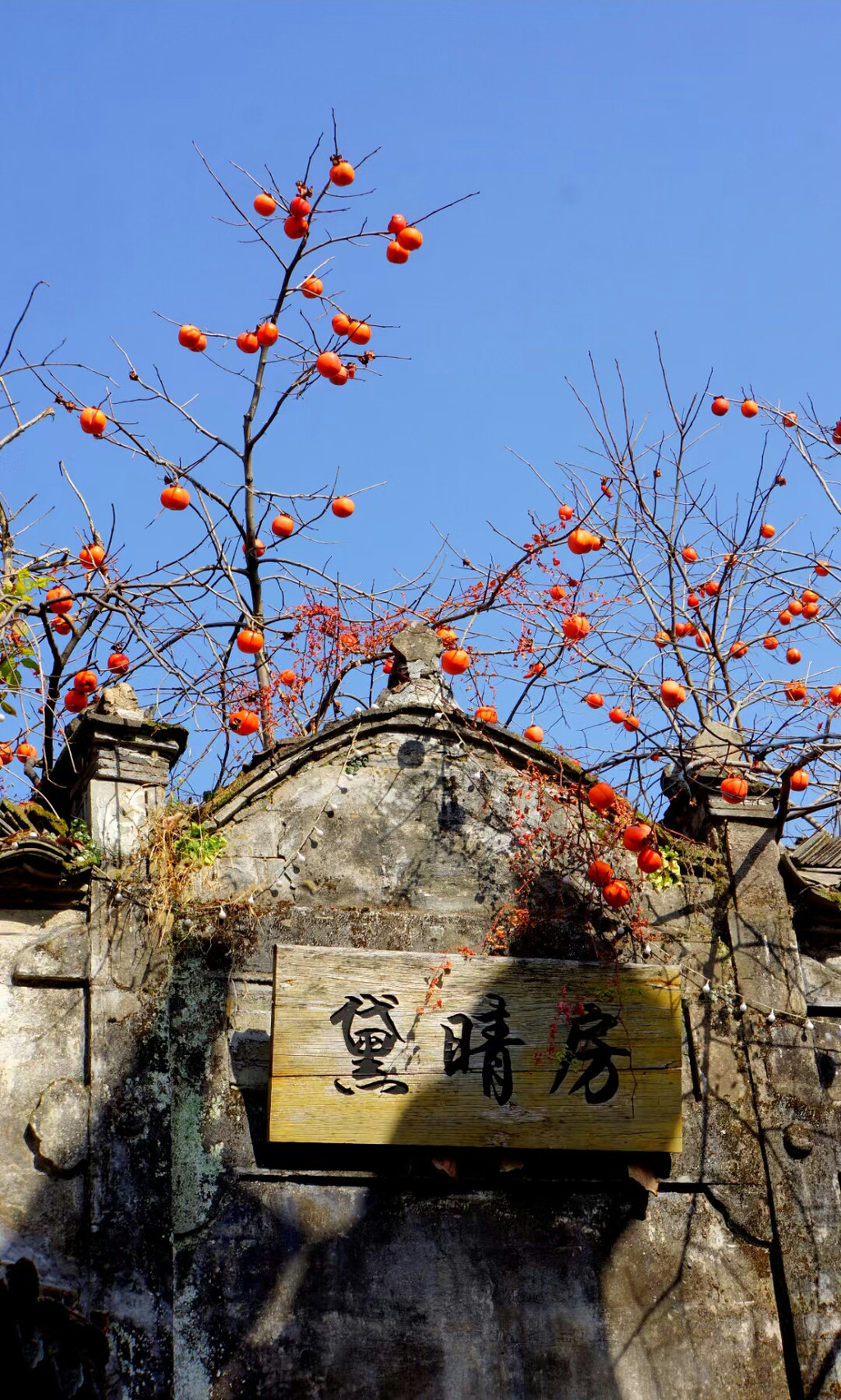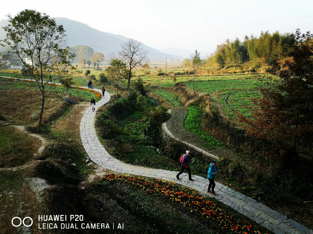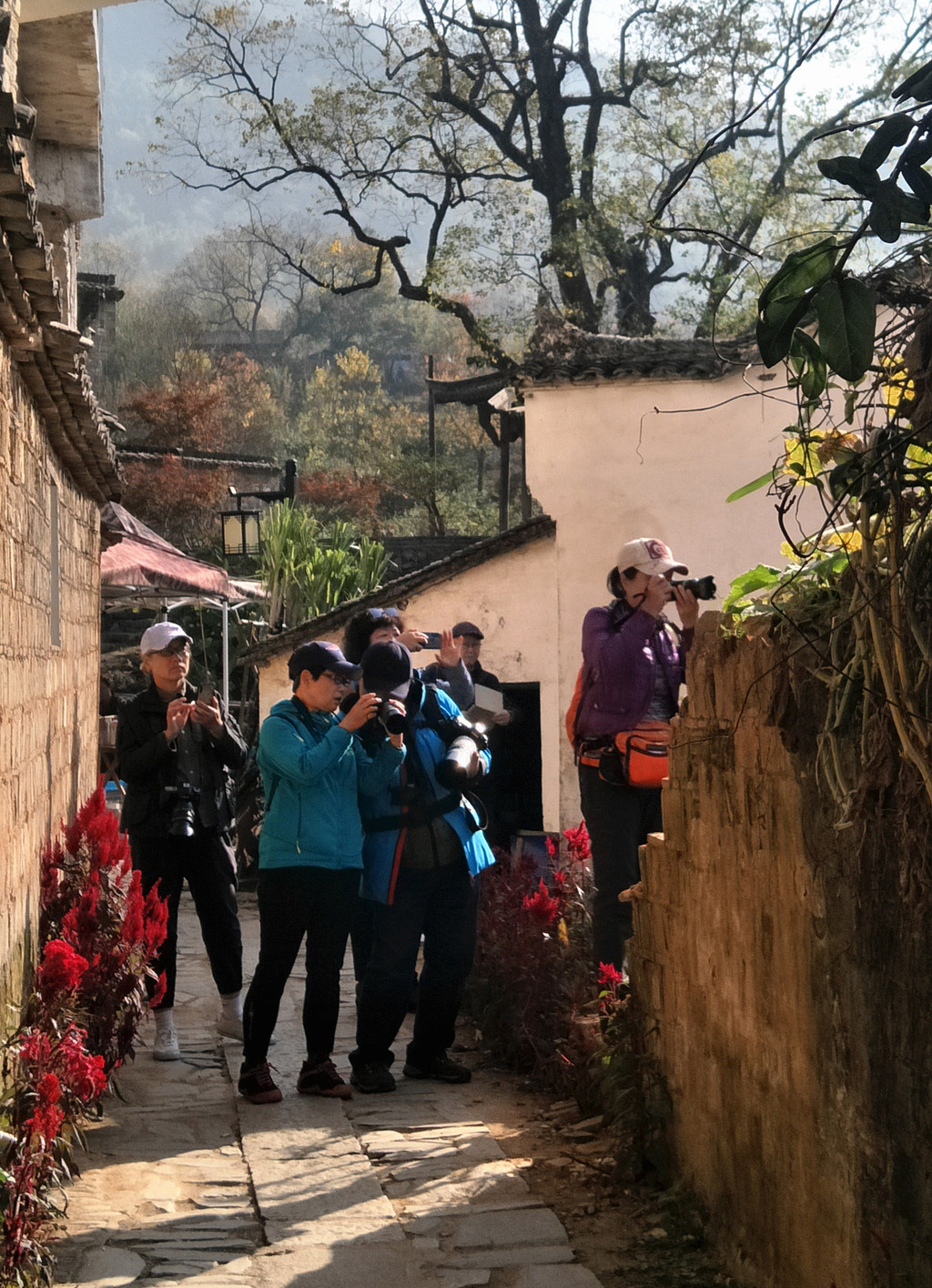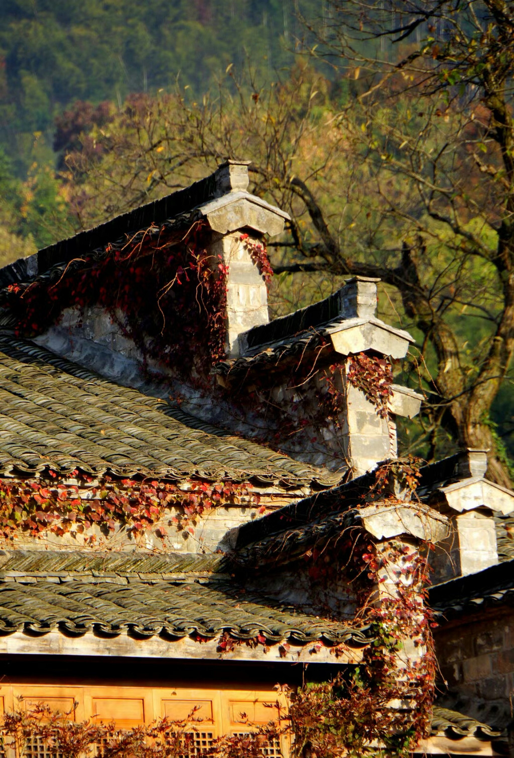 白墙黑瓦马头墙顶,典型的徽派建筑风格,再有秋季那姹紫嫣红色彩的映衬真是绝妙的搭配。