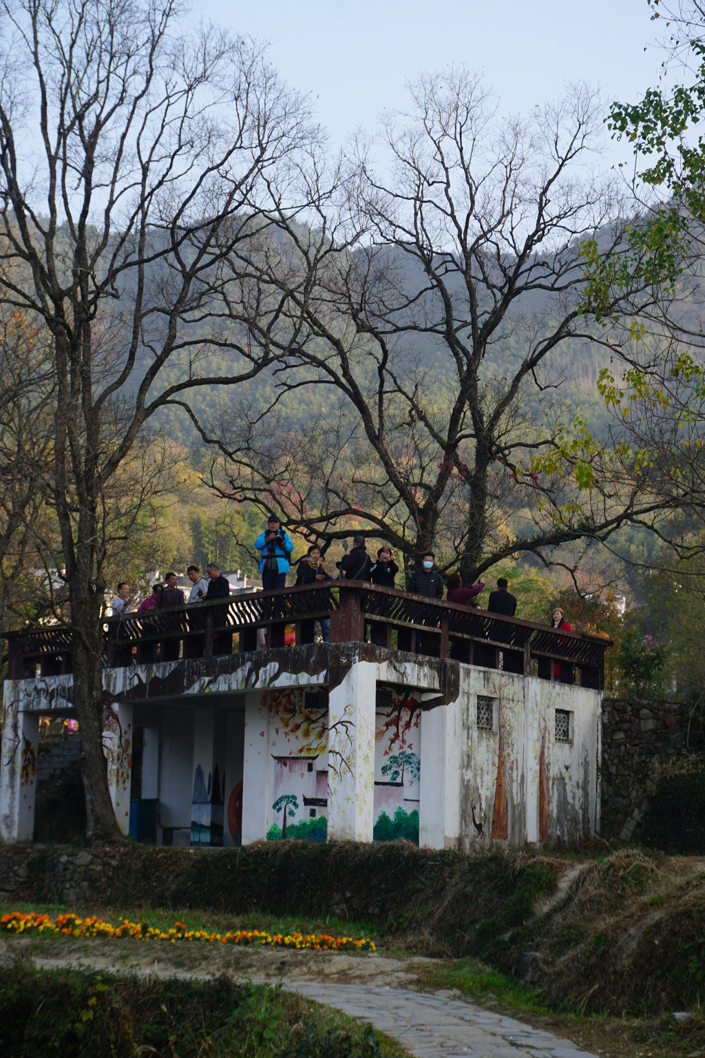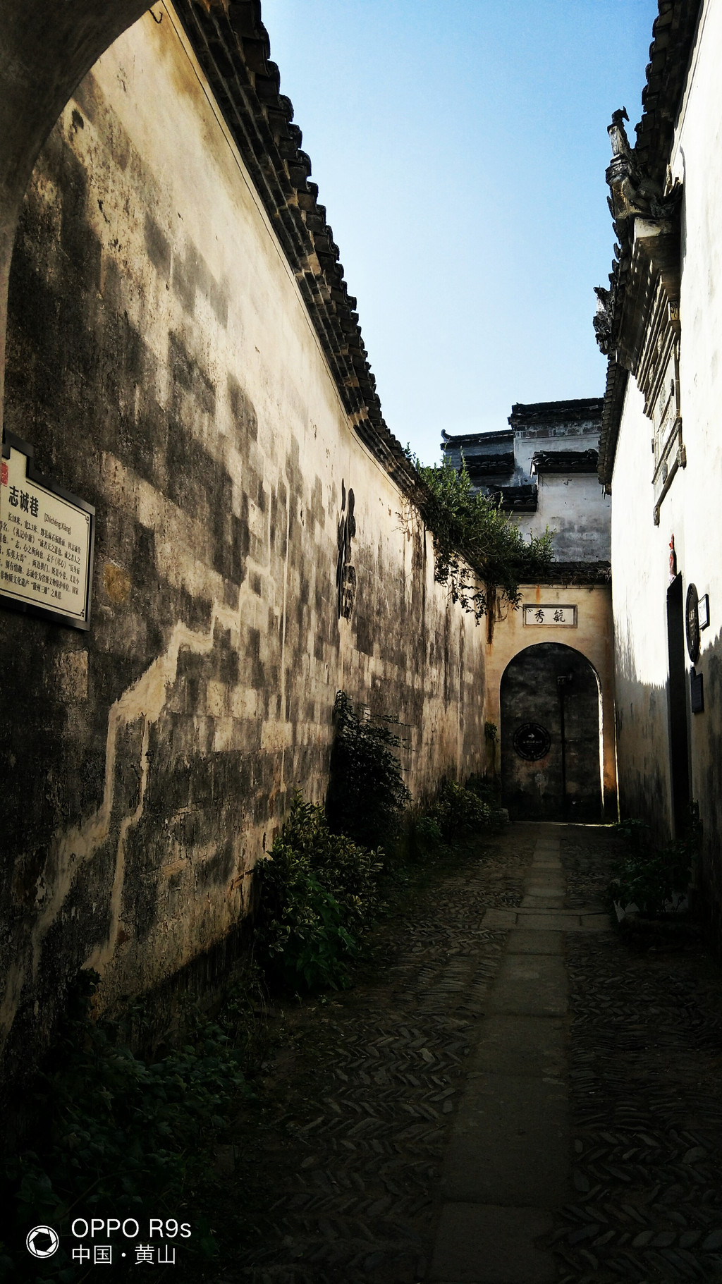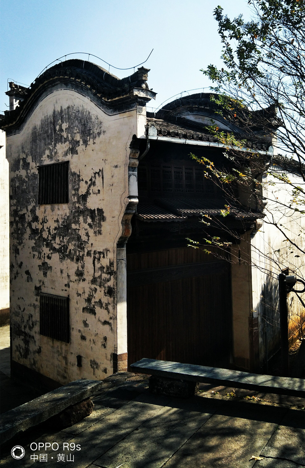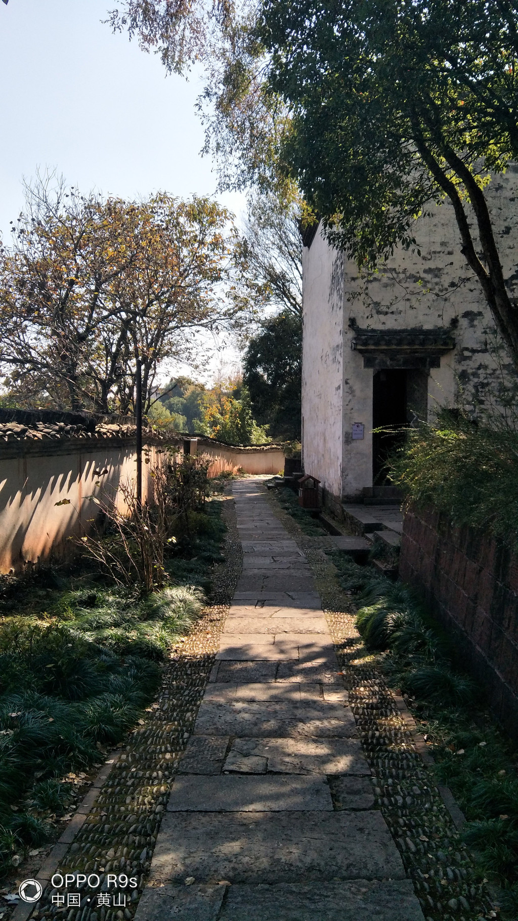 白墙黑瓦马头墙顶,典型的徽派建筑风格,再有秋季那姹紫嫣红色彩的映衬真是绝妙的搭配。